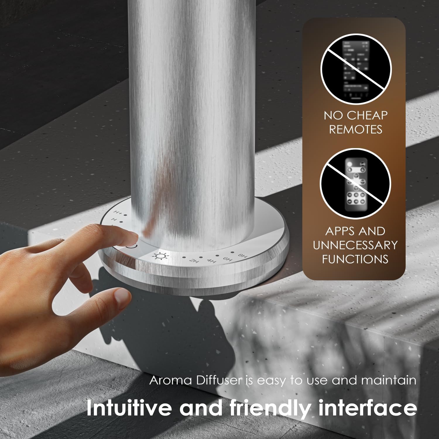 - Operation - When first using, it must be plugged in order for the diffuser to be activated and work. When using its touch buttons, you must press and hold the power button until it turns on.When refilling the container, insert the diffuser head into the diffuser body and be sure to screw the diffuser head clockwise tightly, otherwise it will not diffuse.