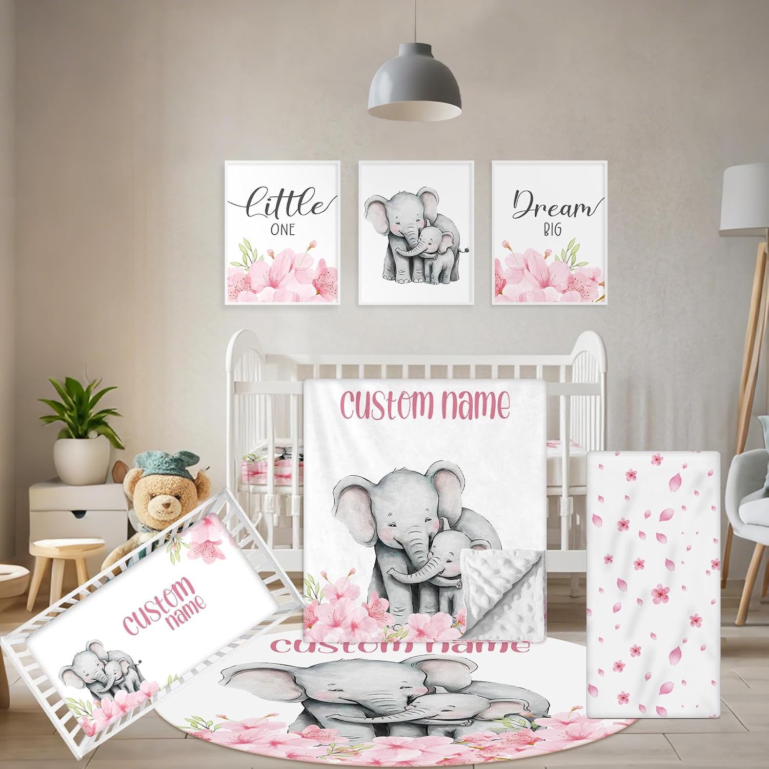- Complete Set: This customized baby bedding set includes a double layer dotted backing blanket, crib sheet, changing pad cover, baby rug and wall arts, designed to add style and comfort to your nursery. The dotted backing of the double-layer blanket will be adored by your little one.