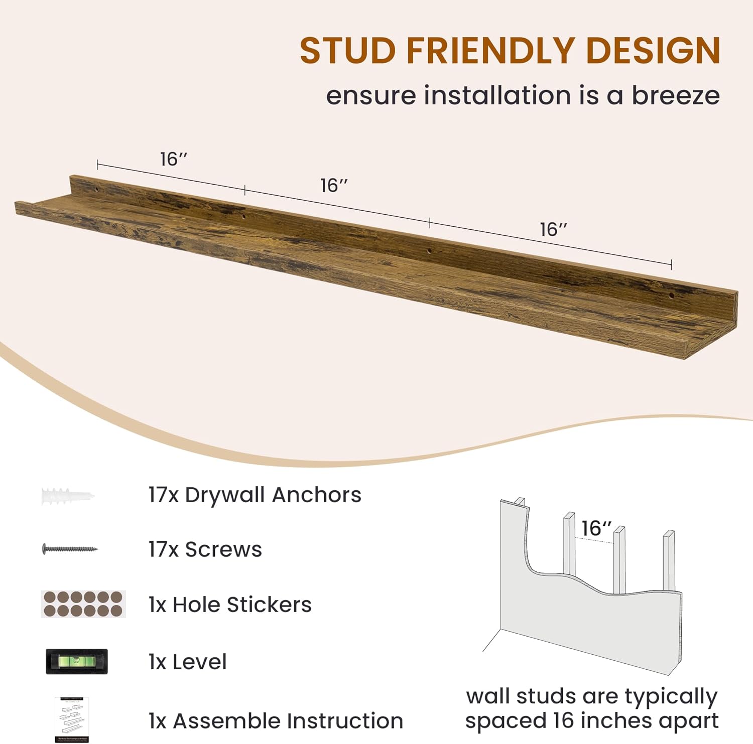 Axeman Picture Ledge Shelf, Floating Shelves for Wall Decor Set of 6, 55 inch Floating Wall Mounted Shelves, Shelves with Lip for Living Room, Bedroom, Nursery, Bathroom, Kitchen, Rustic Brown