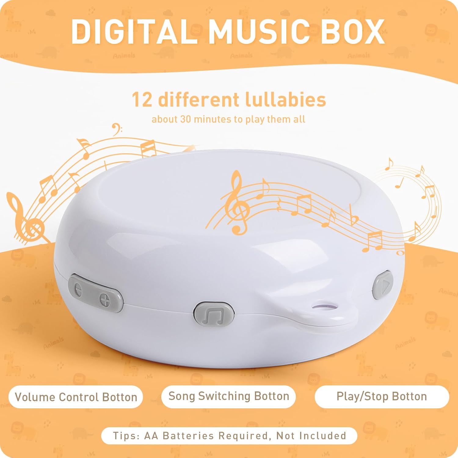 - 12 Different Lullabies: There are 12 different lullabies, you can easily change the song and ajust the volume level.