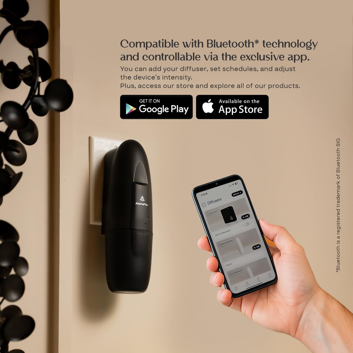 - EASY TO SET UP WITH CUSTOMIZABLE SETTINGS – This new scent diffuser is compatible with Bluetooth technology (Bluetooth is a registered trademark of Bluetooth SIG) and is controlled through the AromaPlan App, available for iOS and Android. It is possible to create multiple advanced schedules (days of operation, specific times, fog intensity, work time, and break time)