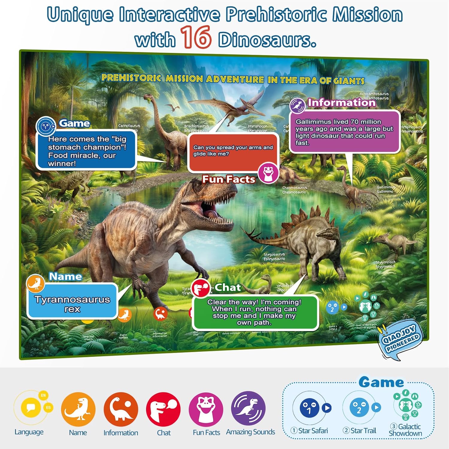 - 【Innovative Interactive Design】This Dinosaur Interactive Poster features 9 engaging modules, including bilingual mode, dinosaur species, information, chat, fun facts, amazing sounds, and three interactive games. With the audio pen, each touch reveals fascinating stories and facts from the prehistoric era. Offering bilingual support (English and Spanish) and personalized narration, it caters to children from diverse cultural backgrounds, making learning both fun and inclusive.