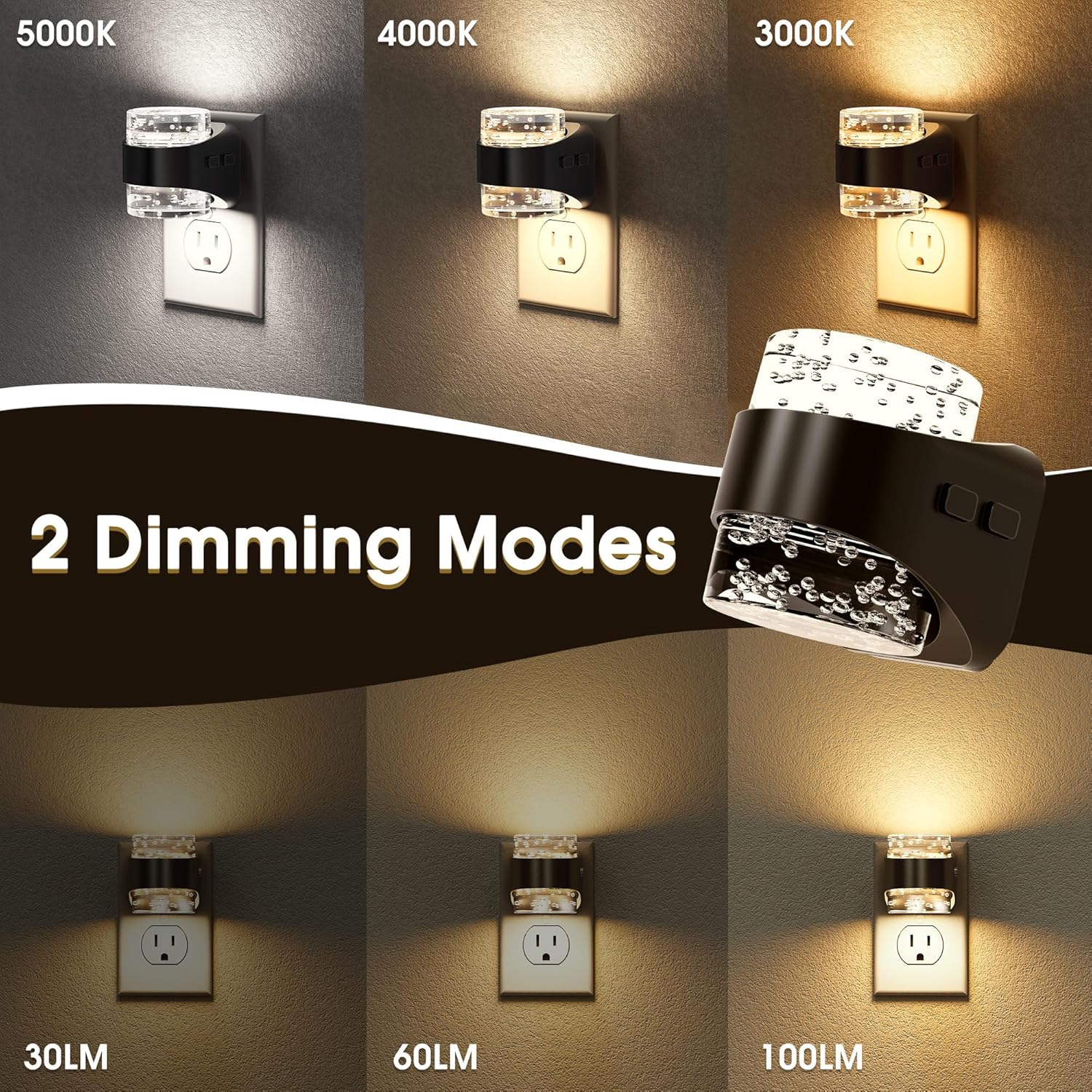 - 3 ADJUSTABLE COLOR TEMPERATURES & 3 BRIGHTNESS LEVELS: Dimmable Night Light Plug in Wall. Switch between warm white (3000K), natural white (4000K), and cool white (5000K) to match any mood or occasion. Adjust brightness from soft 30lm (nighttime comfort) to 100lm (task lighting) with a simple press