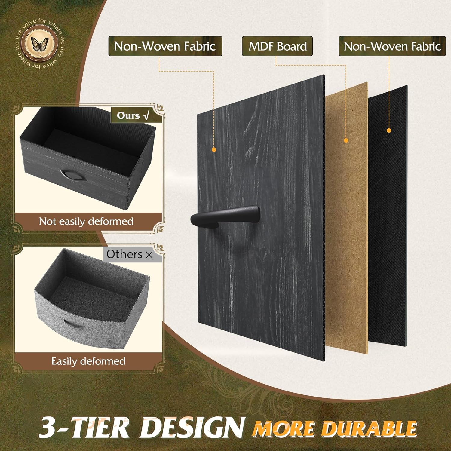 - ✅【Stylish and Versatile】 The furniture is made of sturdy steel frame support, MDF wooden waterproof countertop, and premium non-woven fabric. The back is reinforced with tension bars to enhance overall stability, making the drawer very easy to slide in and out and align correctly. Ensure safe and worry free use. The wooden top can bear up to 70 pounds, providing a sturdy surface for items such as televisions or display vases, lights, and books