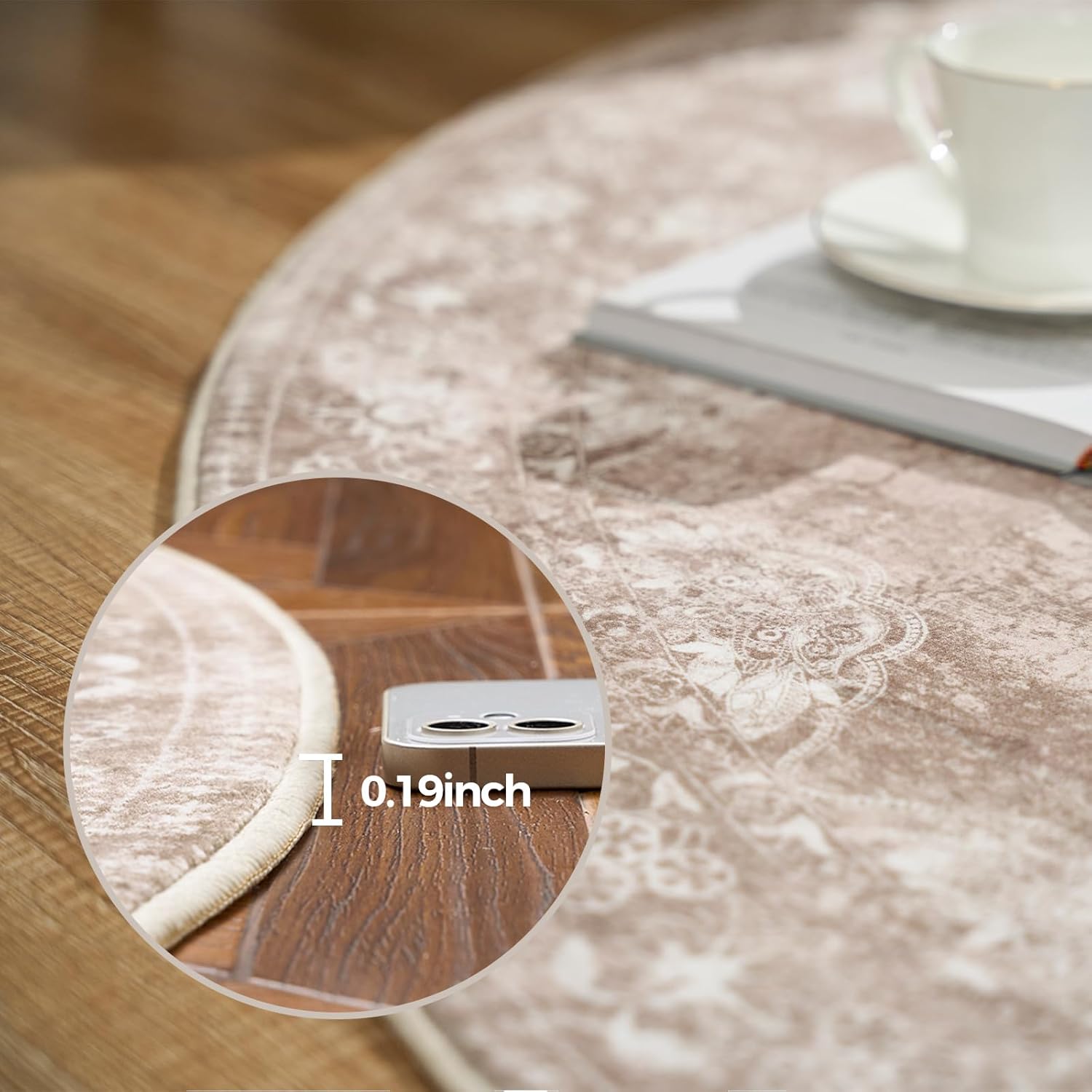 jinchan Round Rug 8ft Area Rug - Brown Vintage Floor Mat Kitchen Indoor - Washable Circle 8' Thin Floral Print Carpet Retro Farmhouse Non Slip Dining Room Living Room Bedroom Office