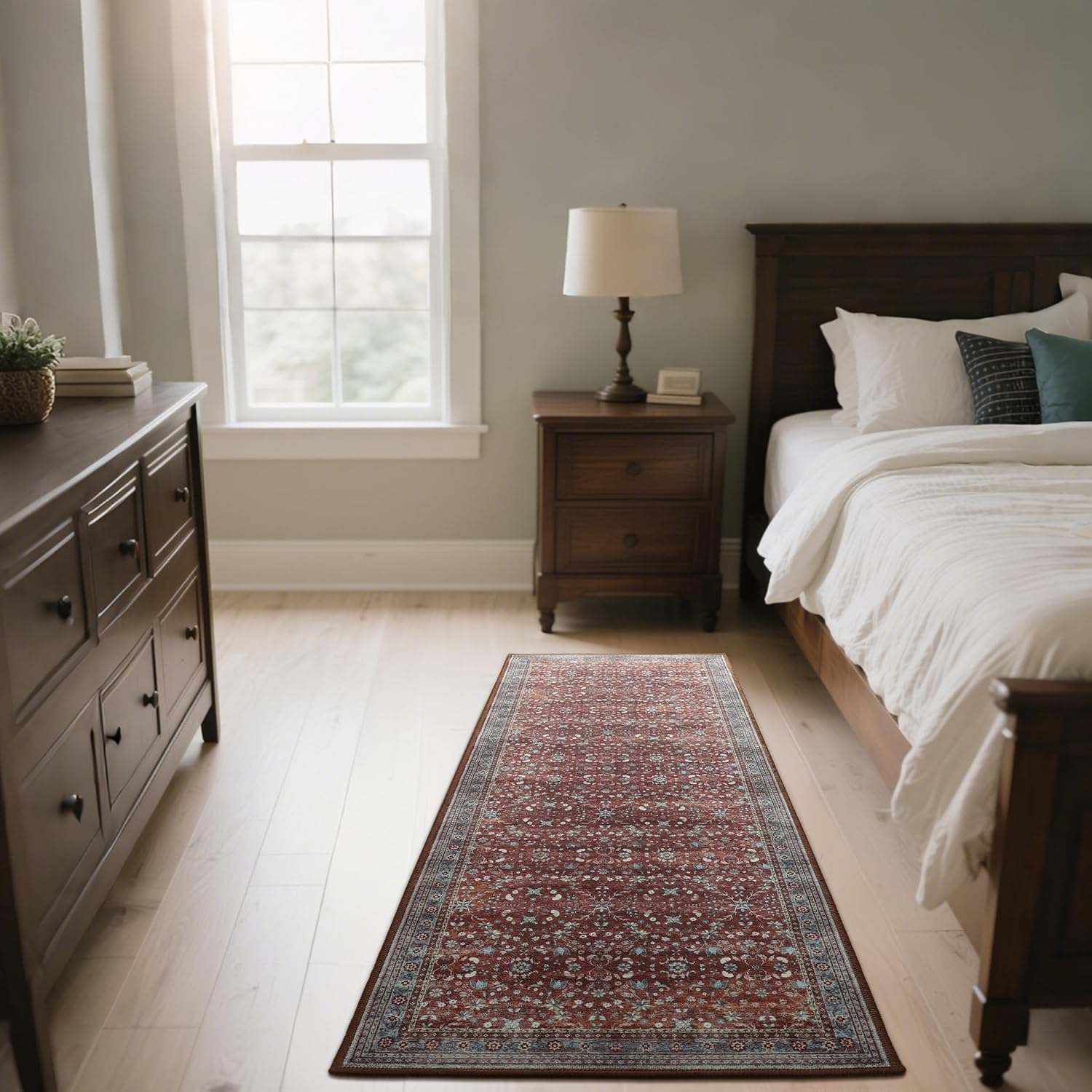 2x6 Washable Kitchen Runner Rug for Hallways, Non Slip Laundry Runners for Bathroom, Low Pile Rubber Backed Rugs for Entryway, Vintage Floral Carpet for Living Room Bedroom Brick Red