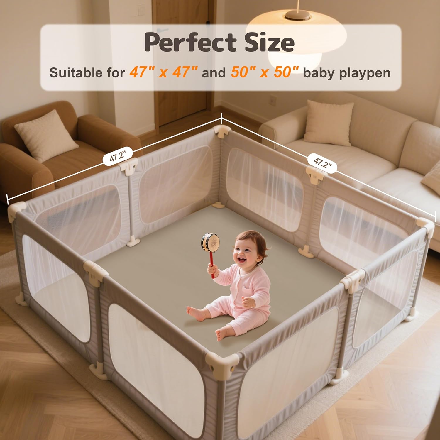 - Versatile & Neutral Colors - This foam play mat is 47x47 inches and fits most playpens (47 inches/50 inches sizes), living rooms, nurseries, playrooms. Gender-neutral aesthetic (brown/beige/gray/blue) blends in with any decor. Installs in minutes, no complicated assembly required