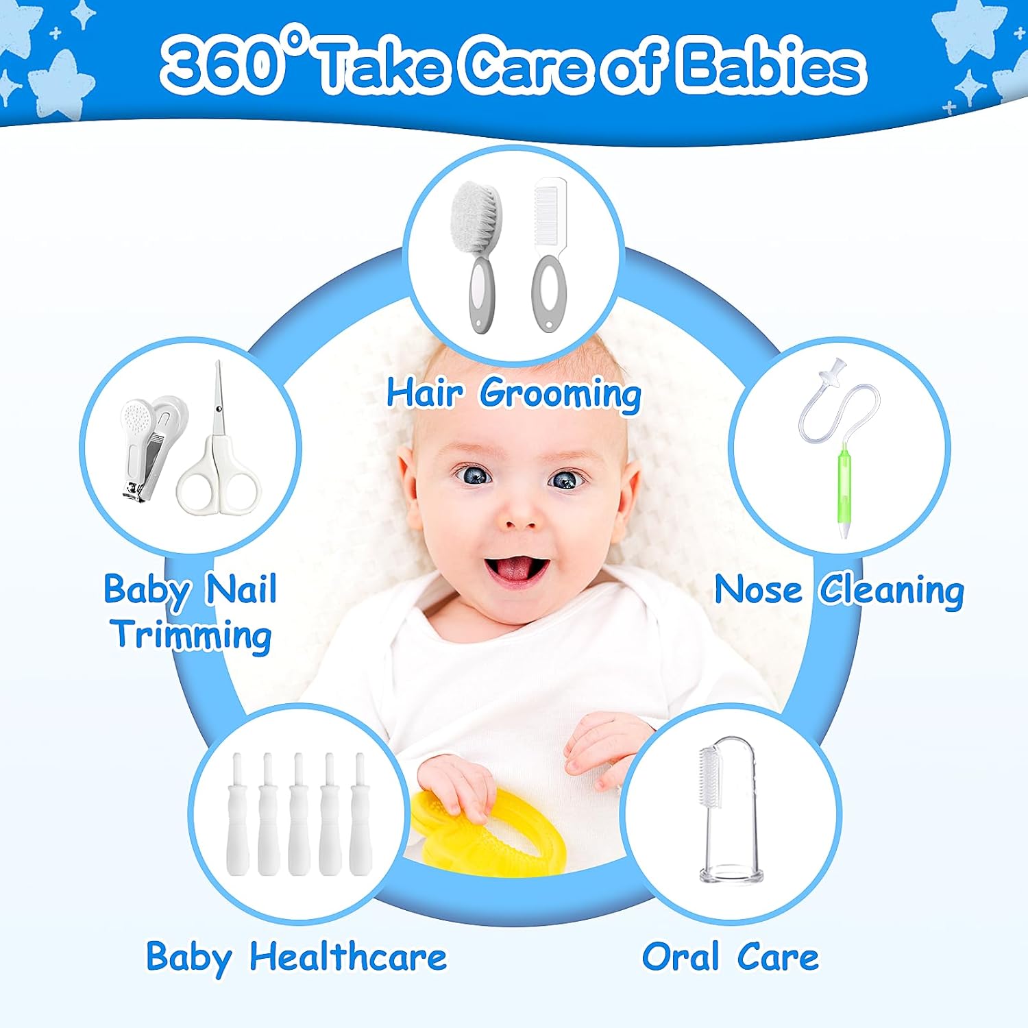 - 21 in 1 Baby Healthcare And Grooming Kit: The package comes with scissors, finger toothbrush, hairbrush, hair comb, medicine dropper, nasal aspirator (included 2 replacement heads), nail files, nail clipper, liquid medicine spoon, silicone brush head, tweezers, 5pcs gas and colic relievers, hygiene sponge set, and storage case, specially designed for baby newborn baby's daily needs.