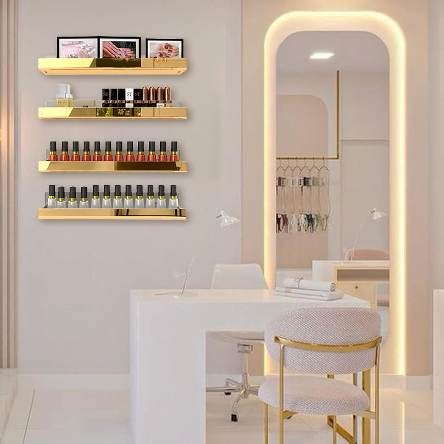 - Elevate your interiors with our Golden Mirror Acrylic Shelves - where sleek functionality meets dazzling decor. Replace dull walls and uninspired storage with these radiant statement pieces that add depth, light, and modern luxury to any room.