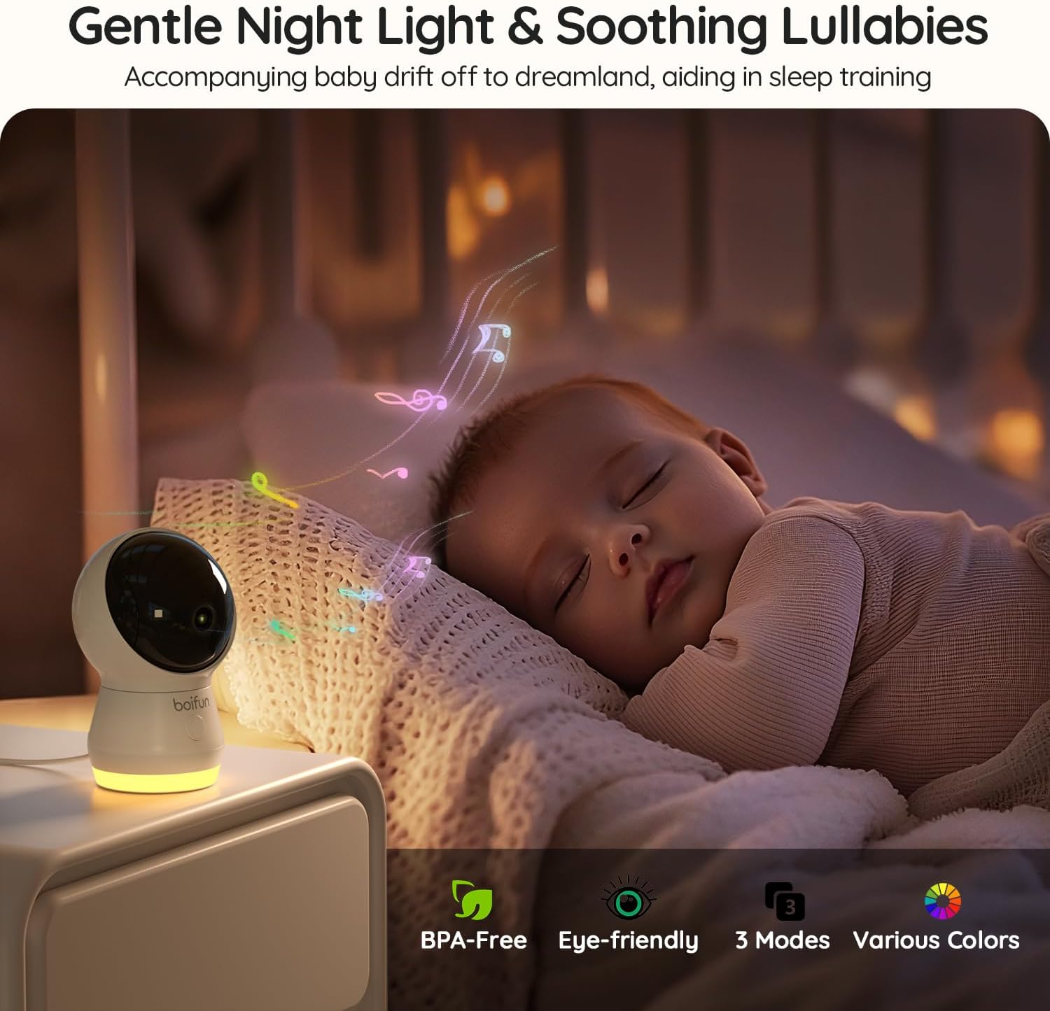 - Special Feature : 2-Way Audio, Soothing Night Light, and Lullabies: The built-in speaker lets you speak to your baby, play relaxing lullabies, or turn on the adjustable night light from anywhere using the baby monitor with wifi and screen. The soft ambient glow and clear two-way talk bring comfort when you can’t be in the room yourself., Clear visibility and proactive protection help you rest easier, even when your baby stirs at night., Dual Viewing(WiFi App and Local Screen):Use the 5.5" LCD for baby monitor no WiFi operation at home or connect through the baby monitor phone app while on the go. With seamless switching between local and remote viewing, this baby monitor with app and screen gives you full access and flexibility. It works smoothly with both Android and iOS devices as a wifi baby monitor for smartphone., Intelligent Monitoring, Day and Night:The upgraded 4MP HD camera with infrared night vision and a full pan-tilt range (335° horizontal, 115° vertical) allows complete crib coverage. With smart motion, noise, and cry detection, this boifun baby monitor with camera and audio instantly alerts you via both the screen and your phone., Private, Secure, and Always Protected: Store recordings with confidence using AES128 encryption, whether through cloud or local microSD (up to 128GB). This wifi baby monitor with camera and audio ensures your family's privacy and data security are never compromised. 2-Way Audio, Soothing Night Light, and Lullabies: The built-in speaker lets you speak to your baby, play relaxing lullabies, or turn on the adjustable night light from anywhere using the baby monitor with wifi and screen. Th… See more