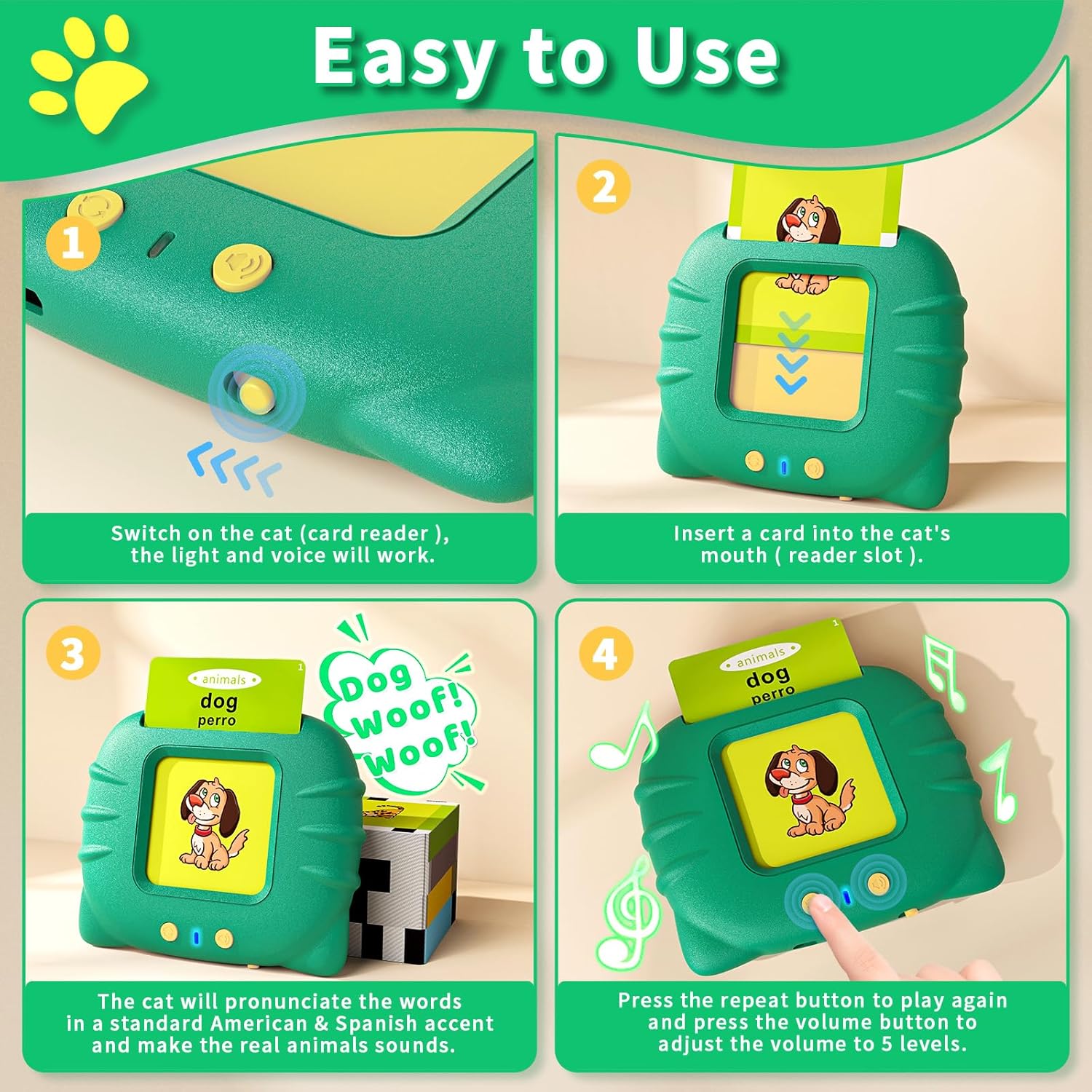 • [ Easy to Use ] - Just put the card into the cute cat machine's mouth ( card reader’s slot ), the cat will pronounce the words with a standard American and Spanish accent. The card reader makes a real animal or vehicle’s sound when an animal card or vehicle card is inserted. There are also letters and numbers cards for preschool children and more cards for kindergarten children, your toddler can press the repeat button to repeat the pronunciation and sound, adjust volume to 5 levels.