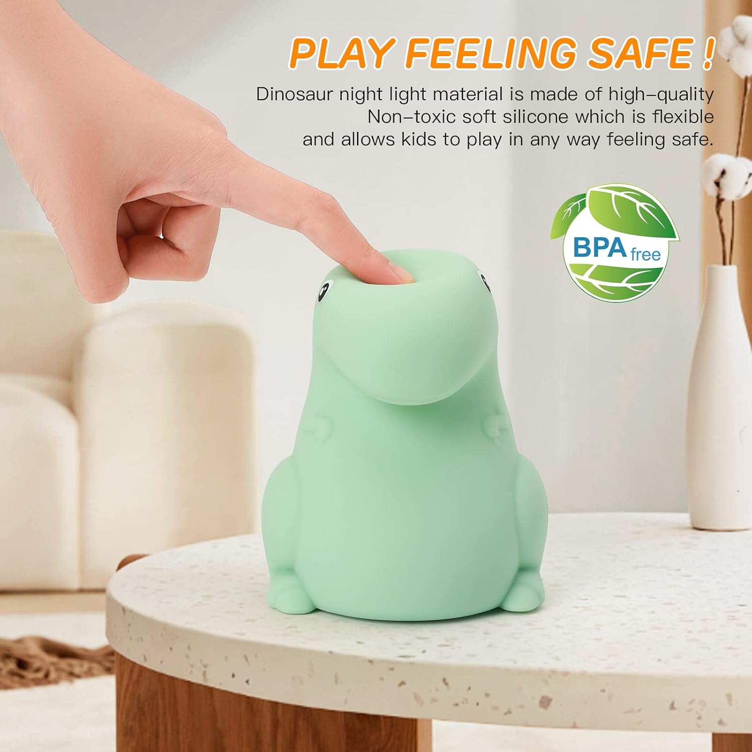 - ๐ถSAFETY & SQUISHY: This flexible and soft dinosaur Night Light material is made from BPA-free smooth silicone that allows you to play in any way and keeps its original shape after heavy long-term use, Washable to keep it clean forever! The one-piece design of the back parts cannot be dropped due to children's pulling, chewing, etc. To ensure the absolute safety of children's use, parents can be rest assured