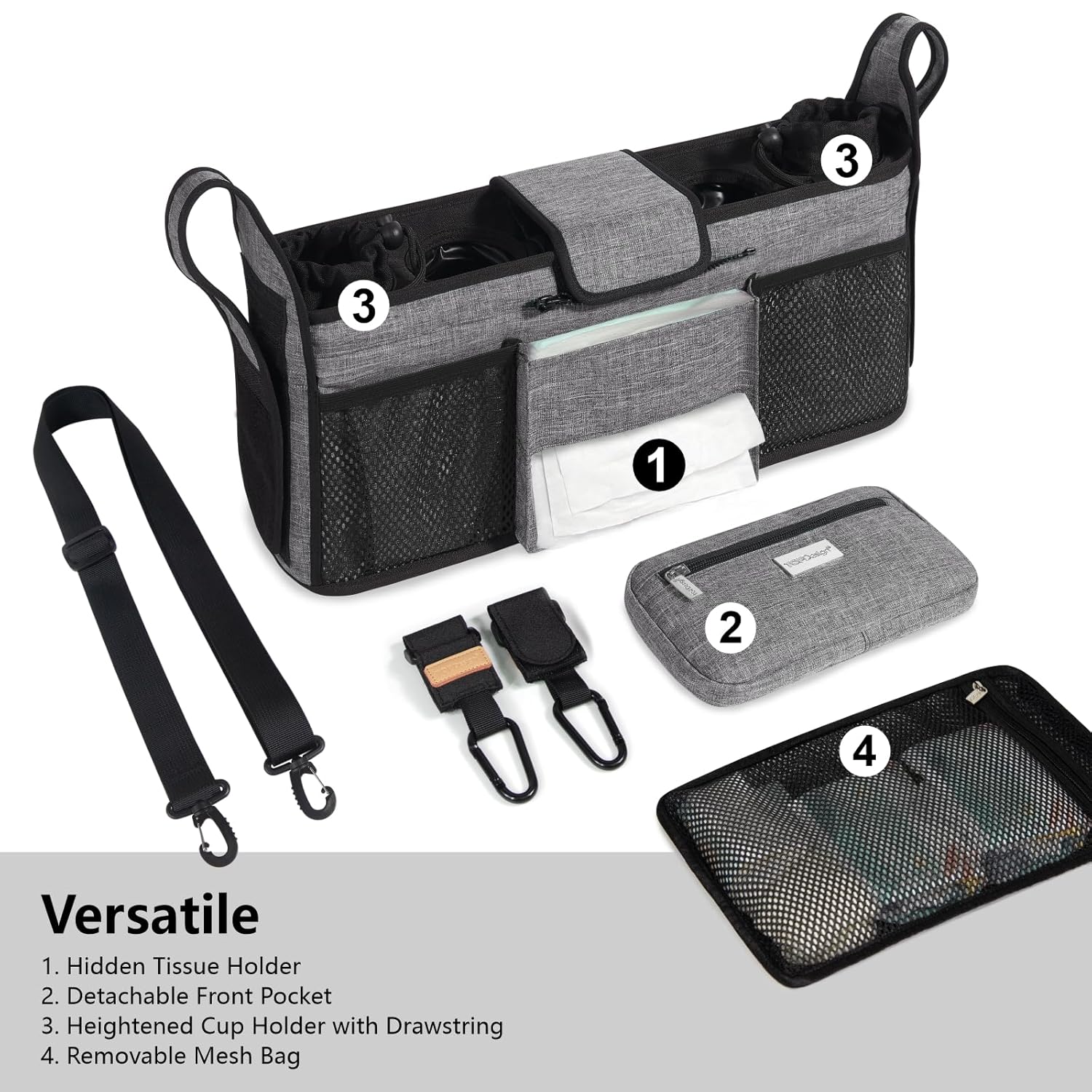 TOPDesign Universal Baby Stroller Organizer, Double Stroller Caddy with Detachable Mesh Bag & Heightened Insulated Cup Holders & Non-Slip Secure Hooks Accessories, Fits Most Strollers (Grey)