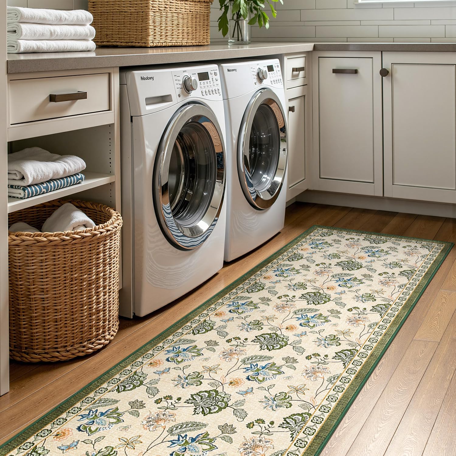 jinchan 3x10 Floral Runner Rug for Hallway Washable Kitchen Runner Vintage Romance Design Non Slip Thin Indoor Floor Cover Low-Profile Throw Carpet for Entryway Bathroom Bedroom Porch, Green/Beige
