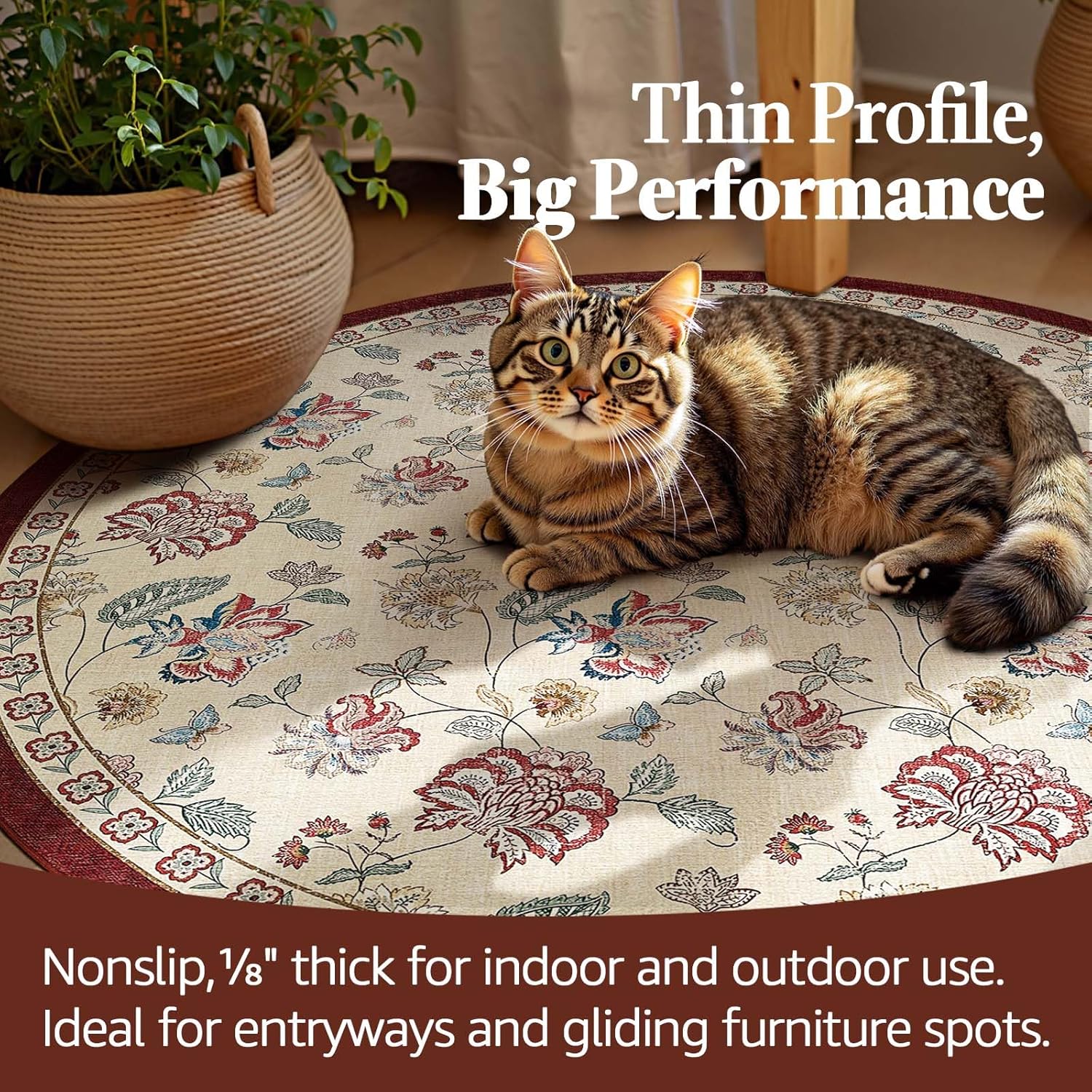 jinchan 7ft Floral Round Rug for Dining Room Washable Living Room Rug Vintage Romance Design Non Slip Indoor Floor Cover Lightweight Low-Profile Throw Carpet for Bedroom Porch Patio, Red/Beige