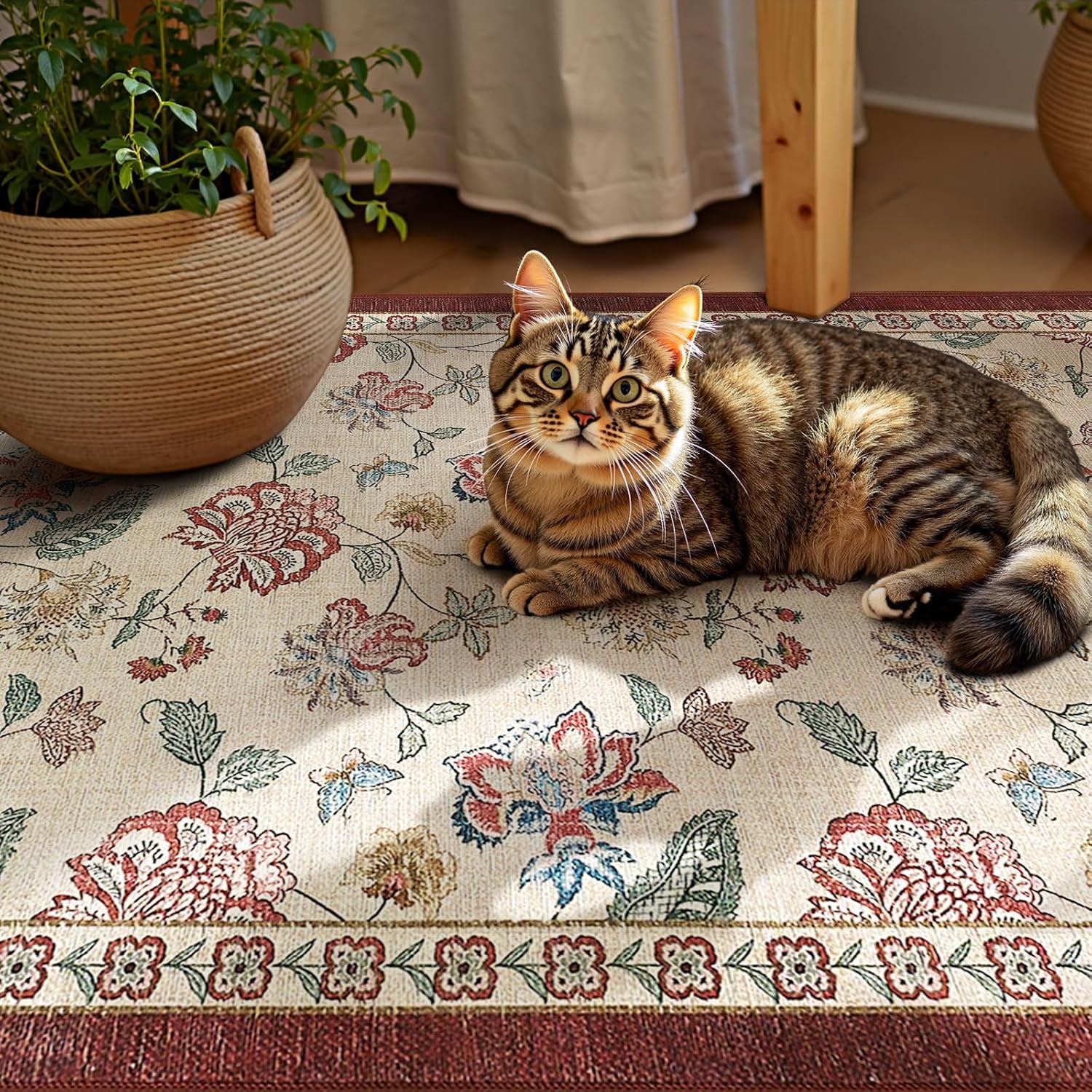 jinchan 8x10 Floral Rug for Living Room Washable Bedroom Rug Vintage Romance Design Non Slip Thin Indoor Floor Cover Large Low-Profile Throw Carpet for Dining Room Office, Red/Beige