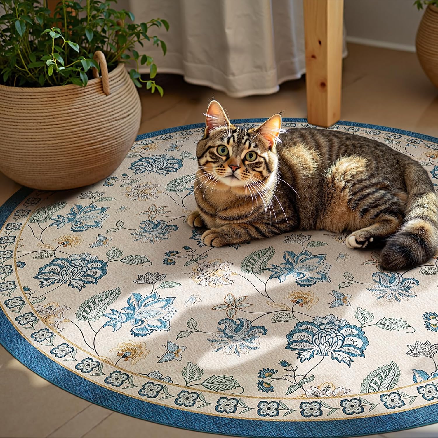 jinchan 6ft Floral Round Rug for Dining Room Washable Living Room Rug Vintage Romance Design Non Slip Indoor Floor Cover Lightweight Low-Profile Throw Carpet for Bedroom Porch Patio, Blue/Beige