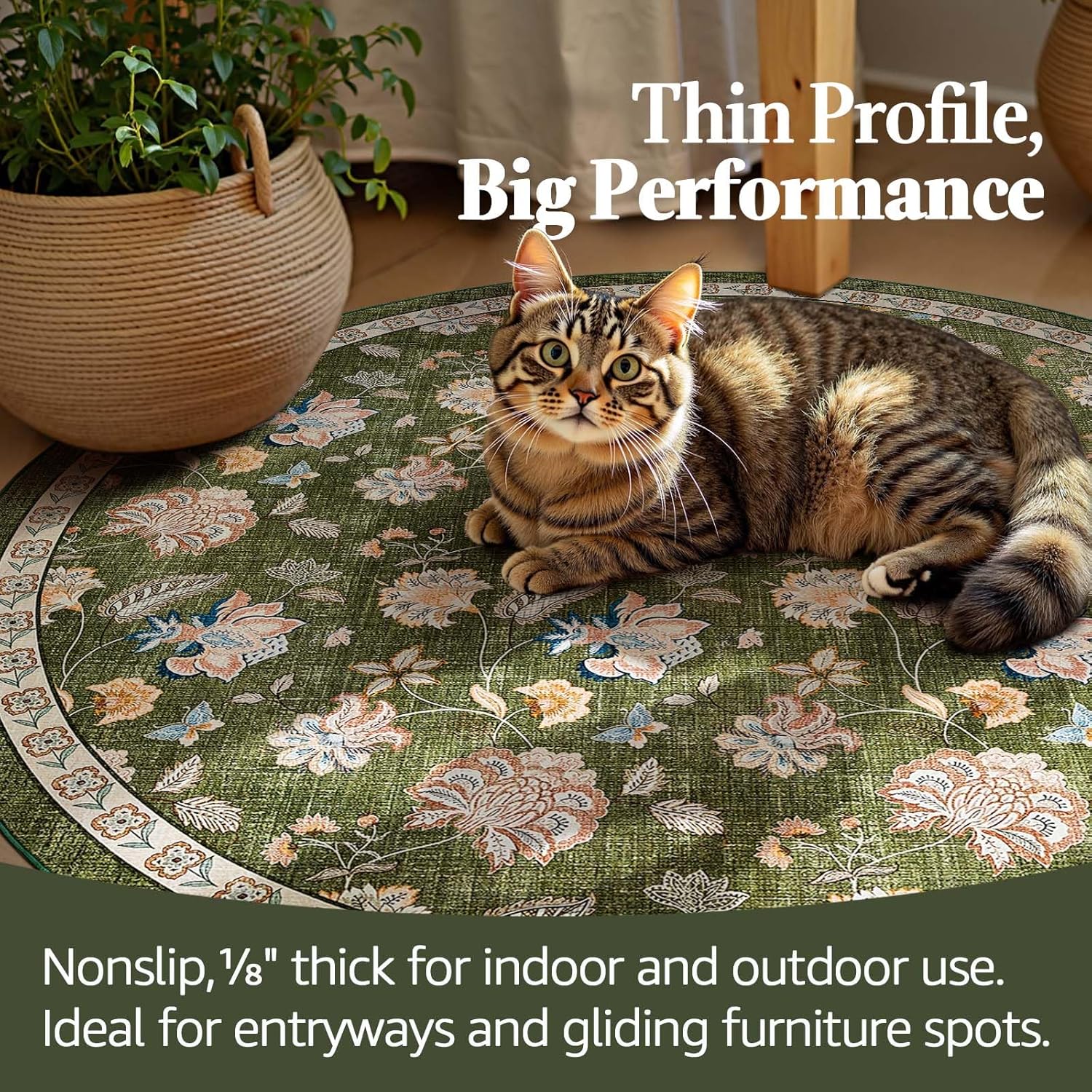 jinchan 8ft Floral Round Rug for Dining Room Washable Living Room Rug Vintage Romance Design Non Slip Indoor Floor Cover Lightweight Low-Profile Throw Carpet for Bedroom Porch Patio, Green