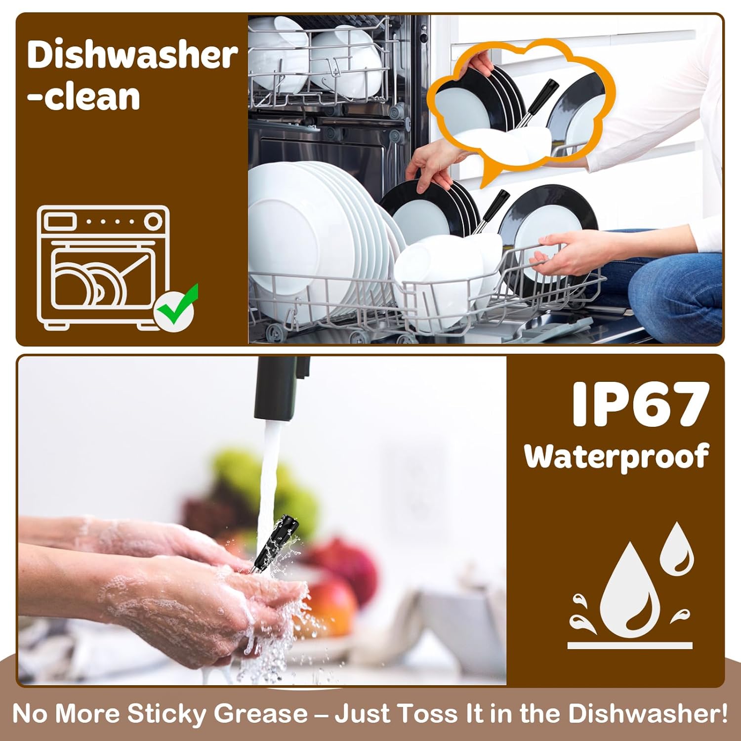 - Waterproof & Dishwasher Safe: Cleaning up after a messy cookout has never been easier! The stainless steel probes are IPX7 waterproof and dishwasher safe, so you can rinse them under running water or toss them in the dishwasher for a thorough clean. The durable, rust-resistant design ensures your probes of digital meat thermometer stay in top condition, ready for your next BBQ session