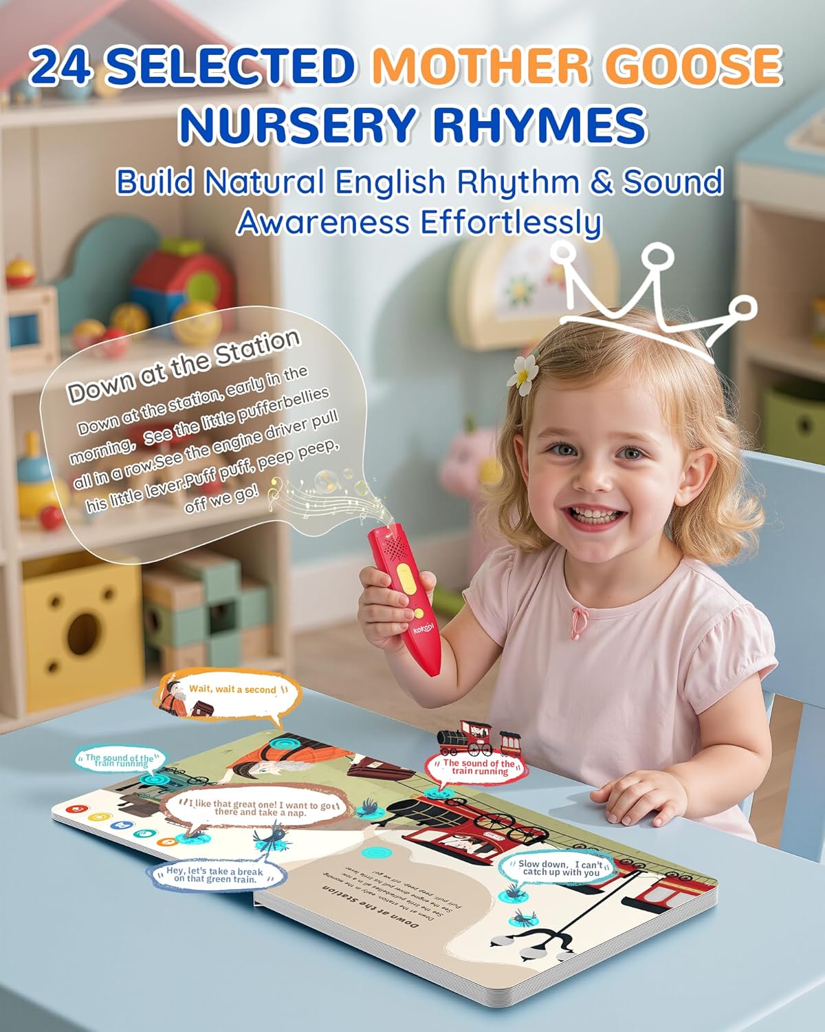 - Toddler Nursery Rhymes & Interactive Learning: KOKODI Early Education Reading Pen is designed for independent use by children aged 2-6. Without any downloads, ready to use immediately upon turning on. Tap to read, simply press the pen on an image or word, and it will read out the content for you. From classic nursery rhymes to fun learning activities, this set keeps kids entertained while helping them build vocabulary, improve listening skills, and develop early literacy, thinking skills.