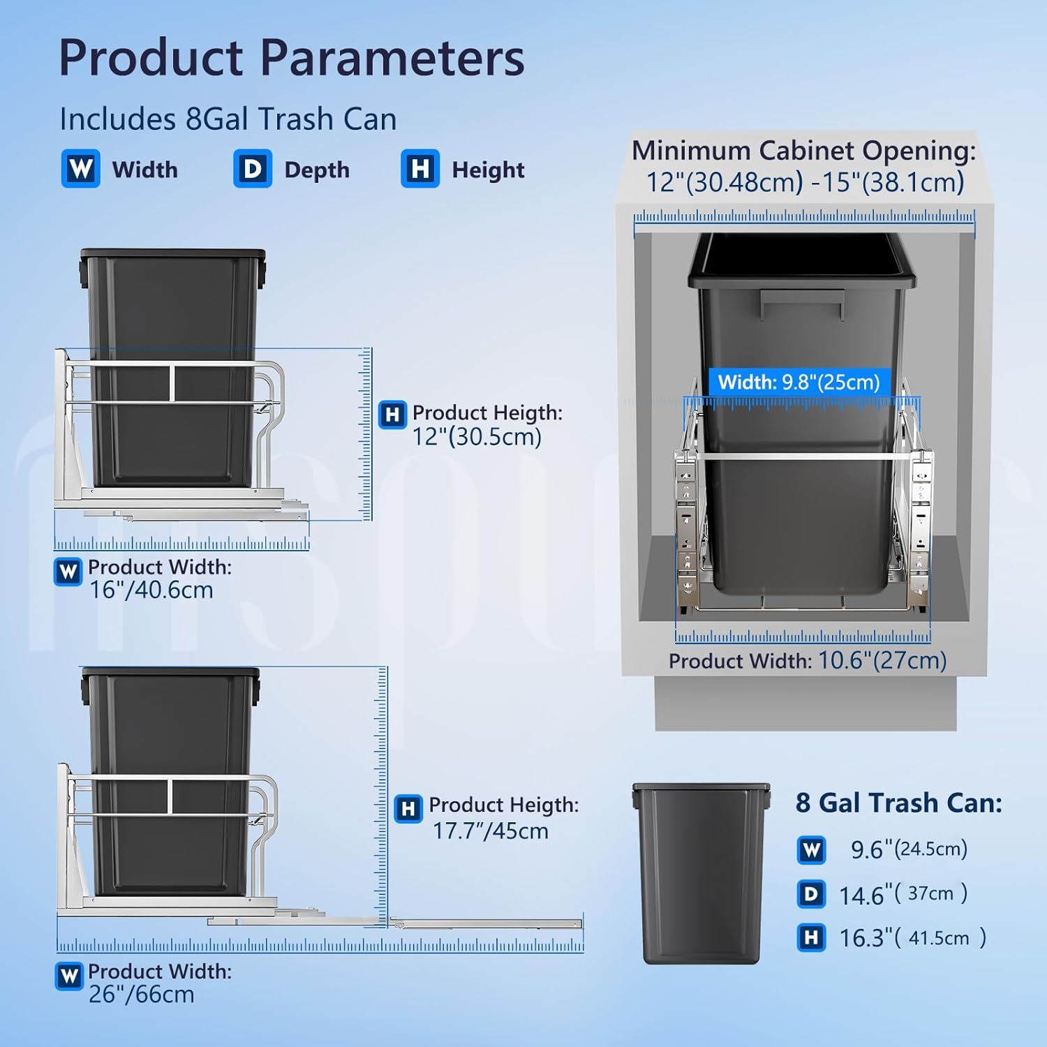 - Heavy Ducty Material: The pull out trash can under cabinet is made of heavy duty structural steel with surface nano-painting technology, which is more resistant to corrosion and rust than normal painting technology, and lasts longer. The under cabinet trash can pull out have enhanced weight capacity, which can withstand up to 100 pounds, no need to worry about bending the slides