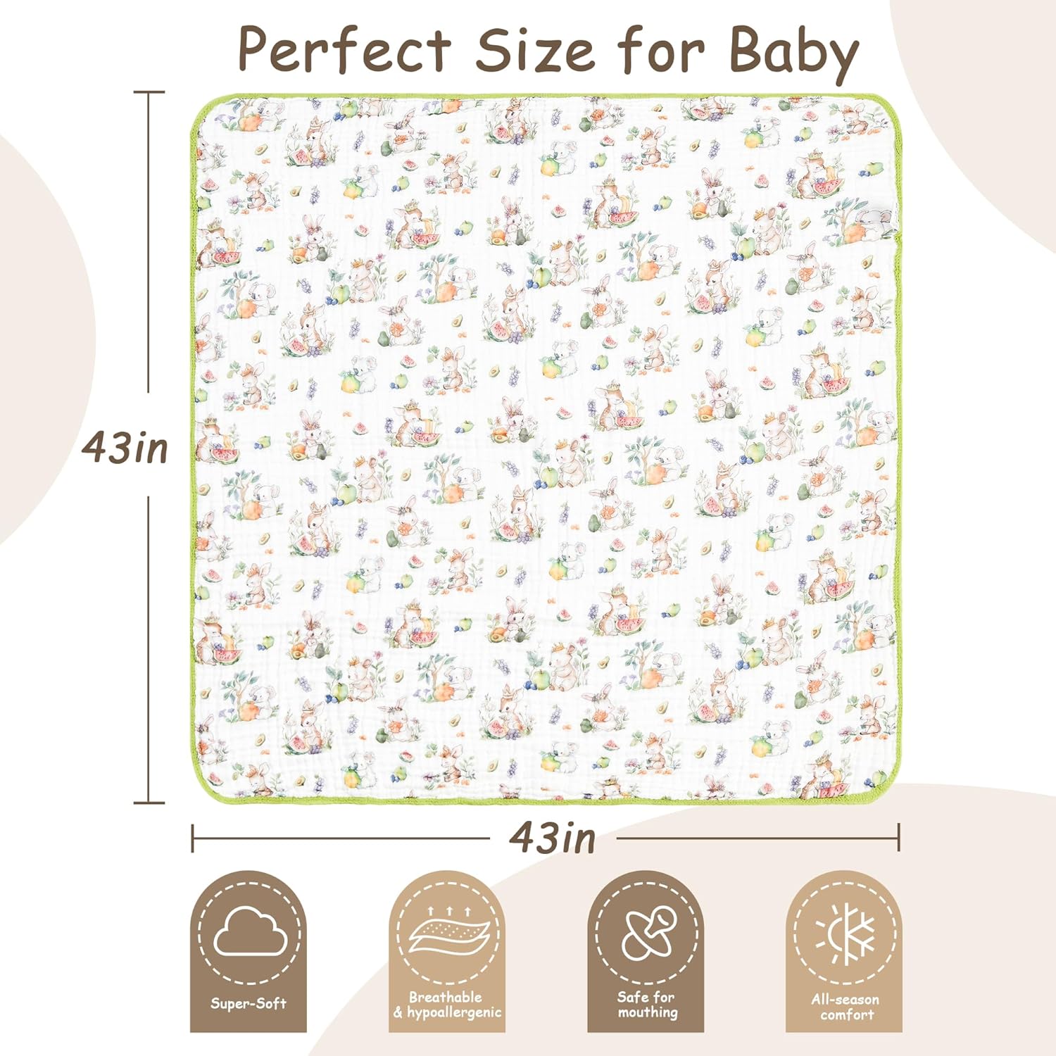 Luxury Muslin Baby Blanket, Soft Swaddle, 6-Layer Cotton Receiving Blanket for Newborn Infant, 43x43 Inch Lightweight Breathable Crib Blanket, Nursery Stroller Toddler Quilt, Animal Print