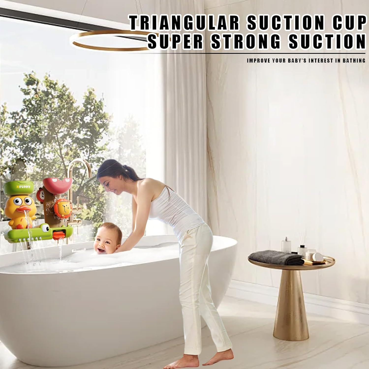 - 【Fun In Bath】The bath toy for toddlers features a duck with eyes that turn and squirt water, a crocodile with teeth that squirt water, and a lion that rotates its head. Pouring water into the container at the top of the toy creates the effect of running water and waterfalls, so children can learn about water and stimulate creativity and imagination.