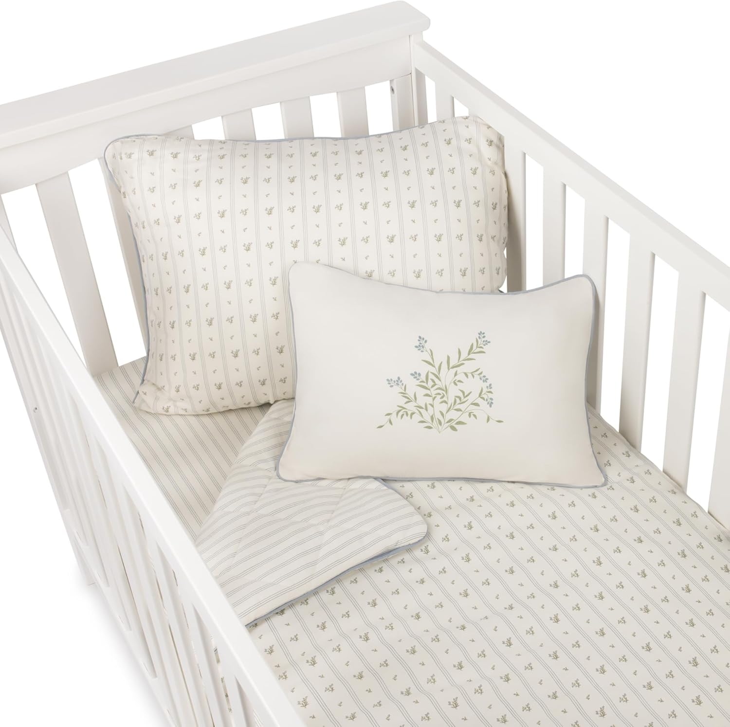 - Adorned with a charming blue berry leaf design on an ivory base with soft blue stripes, this boy mini crib bedding set adds a touch of antique elegance to your baby's nursery décor, making it a perfect choice.