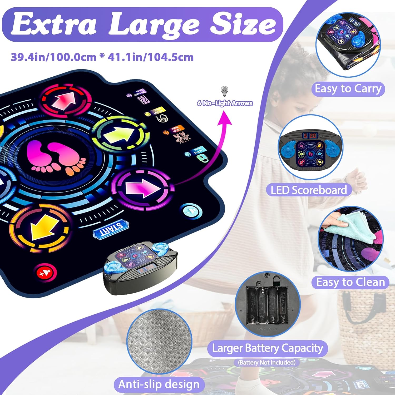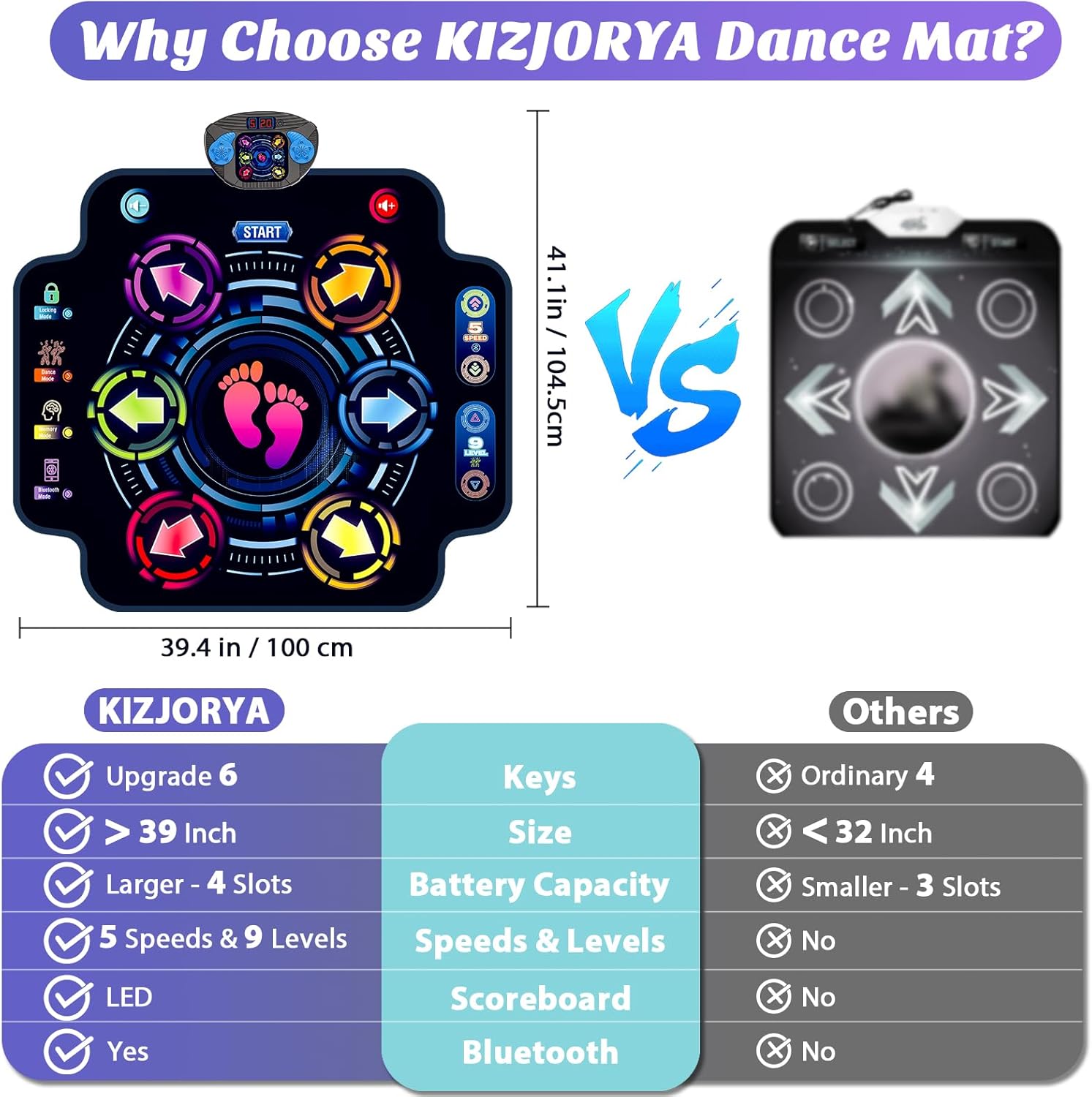 - Enjoy Big Moves on Kizjorya Oversized Play Surface (39x41 inches) --- No need to worry about your child outgrowing it quickly! Our oversized dance mat for kids ages 4-8 and 8-12 years. Kids and their friends can freely dance, challenge various difficulty levels, and use it as a communicative link between them. This larger dance mat not only builds kids' confidence but also enhances their cognitive and social development.