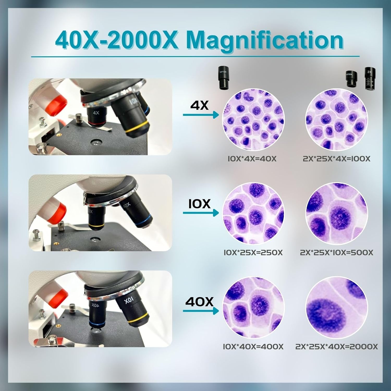 - 【40X-2000X Magnification & Precision Optics】 Equipped with WF10X/WF25X eyepieces, a 2X Barlow lens, and 4X/10X/40X achromatic metal objectives, this microscope offers 10 magnification levels (40X-2000X). Ideal for observing cellular structures, bacteria, and plant specimens with crystal-clear resolution, perfect for STEM education and professional exploration.