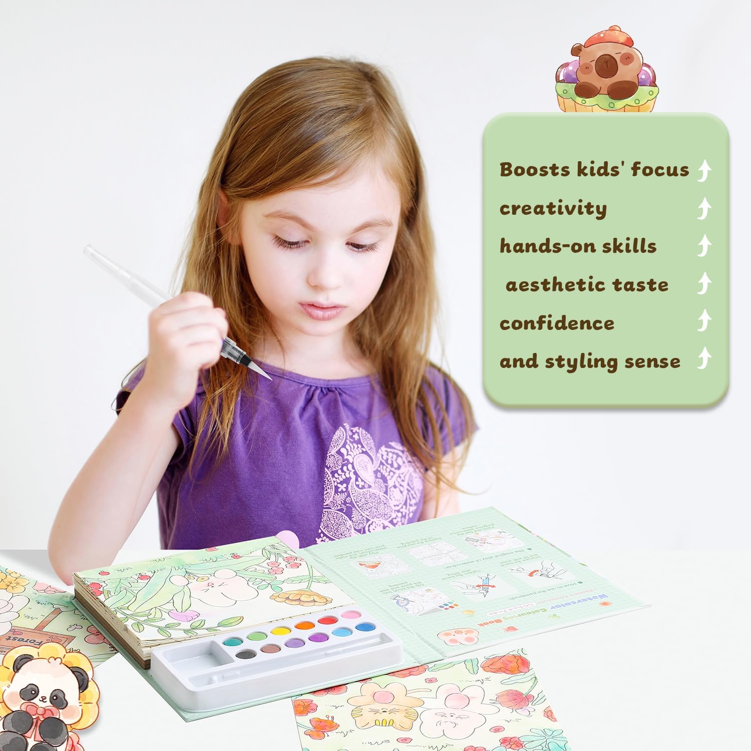 - Keeps Kids Engaged and Boosts Multiple Skills This magical water coloring book captivates children's attention for extended periods, helping enhance their focus, fine motor skills, color coordination, creativity, confidence, and aesthetic awareness. Let kids explore a colorful world filled with imagination and fun.