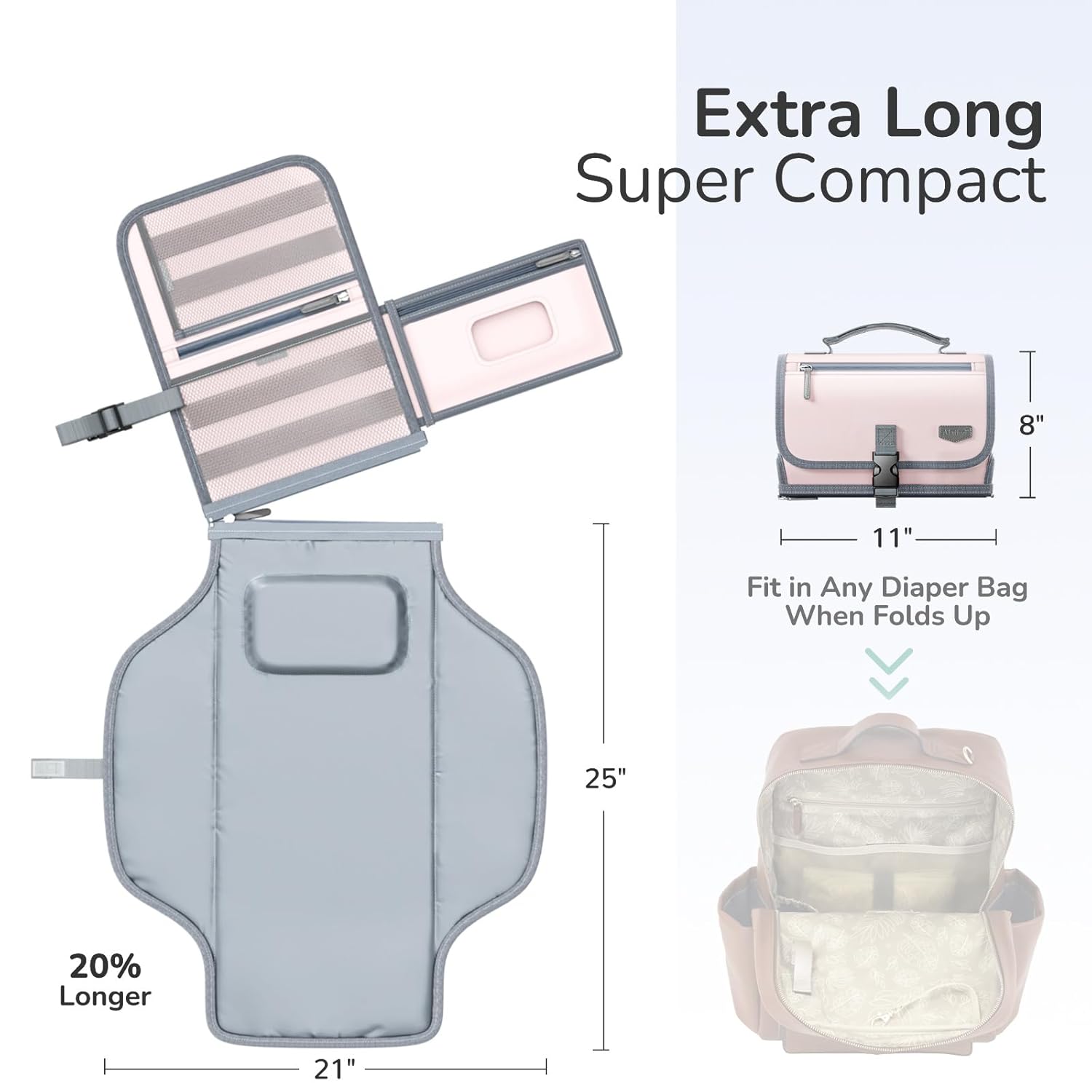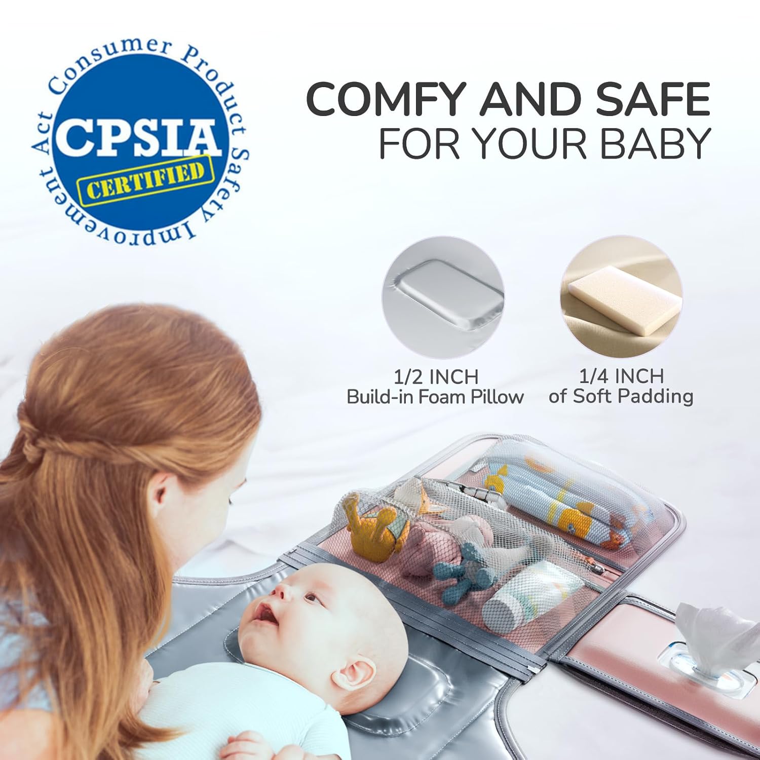 - EASY TO CLEAN AND COMFY FOR BABY. The Alatino Portable Changing Pad is made of premium materials The high-quality padded surface features a built-in ½ inch memory foam pillow to cushion your baby’s head. Also, the waterproof material surface makes it easy to clean with a quick wipe down when messes happen.