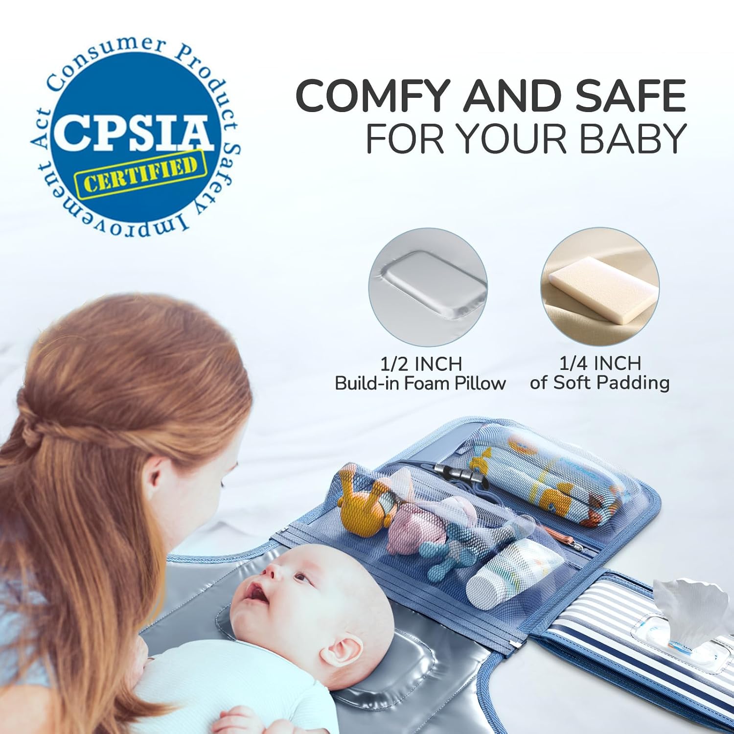 - EASY TO CLEAN AND COMFY FOR BABY. The Alatino Portable Changing Pad is made of premium materials The high-quality padded surface features a built-in ½ inch memory foam pillow to cushion your baby’s head. Also, the waterproof material surface makes it easy to clean with a quick wipe down when messes happen.