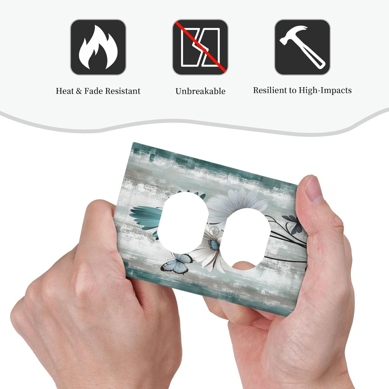 Outlet Covers Rustic Teal Daisy Floral Flowers Butterfly Wood Grain 1 Gang Duplex Wall Plate Decorative Switch Plates Electrical Receptacle Faceplate Light Switch Cover for Bathroom Bedroom