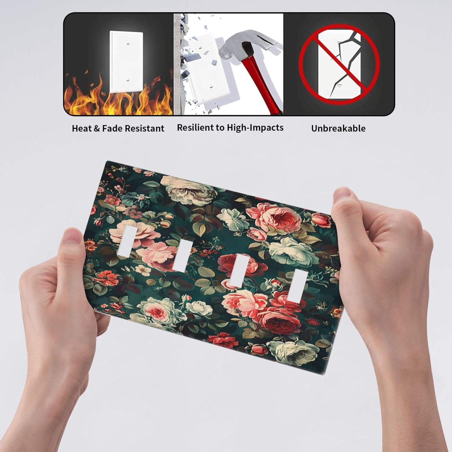 Light Switch Covers Baroque Vintage Peony Flower Floral Quad Toggle Electrical Faceplate 4 Gang Wall Plate Decorative Switch Plates for Bedroom Farmhouse Decor