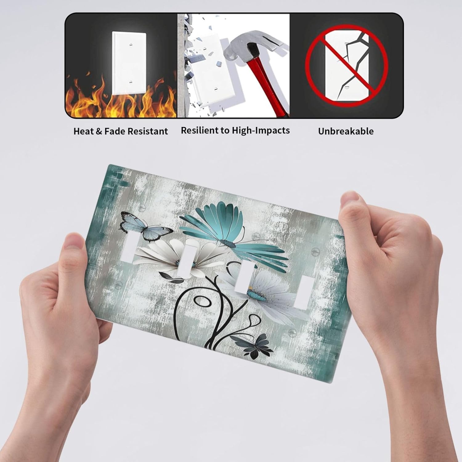 Light Switch Covers Rustic Teal Daisy Floral Flowers Butterfly Wood Grain Quad Toggle Electrical Faceplate 4 Gang Wall Plate Decorative Switch Plates for Bathroom Bedroom Decor