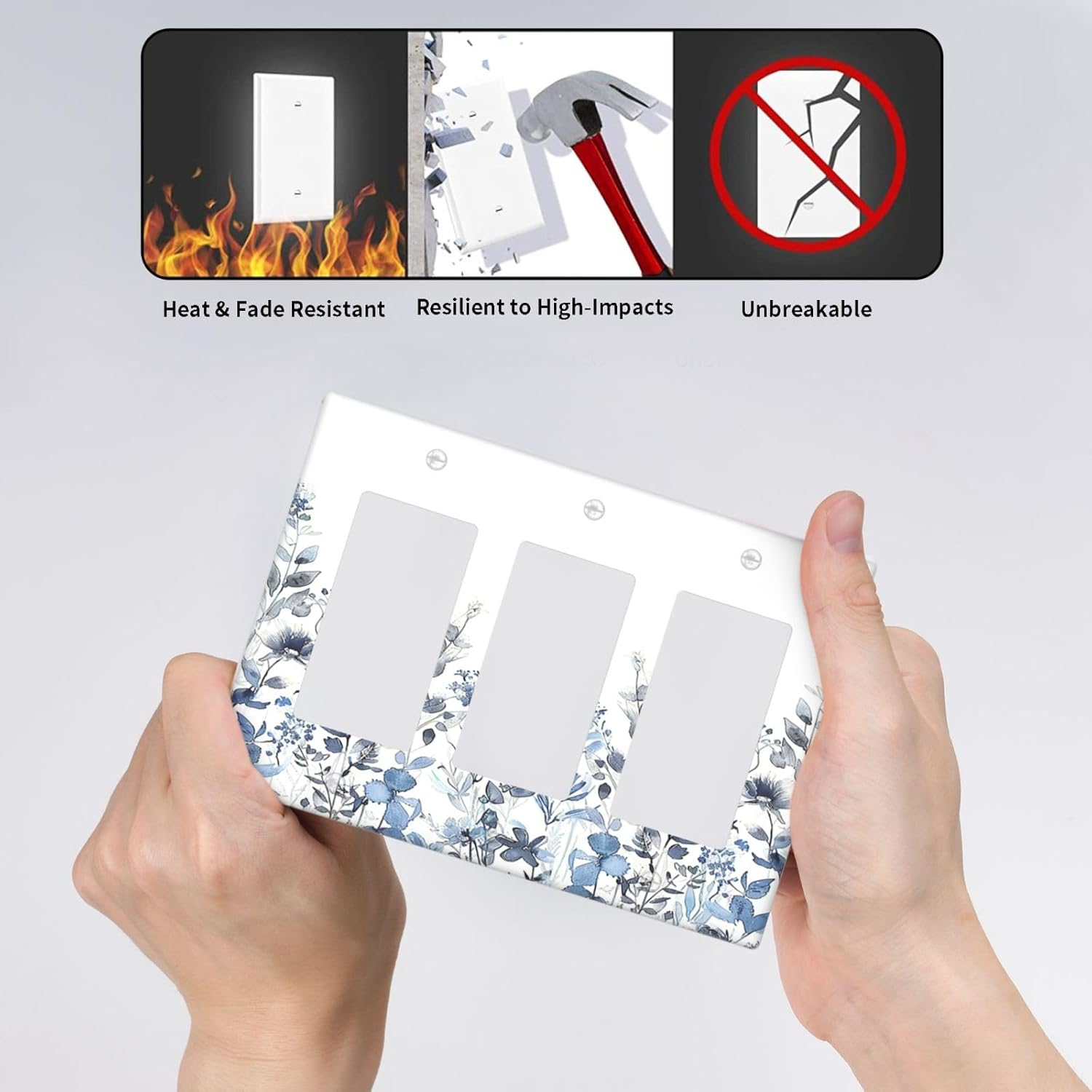 Light Switch Covers Light Blue Watercolor Leaves Plant With Floral 3 Gang Rocker Electrical GFCI Decorative Triple Outlet Wall Plate Cover Switchplate for Bedroom Bathroom Decor