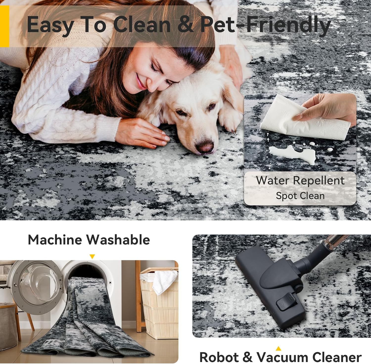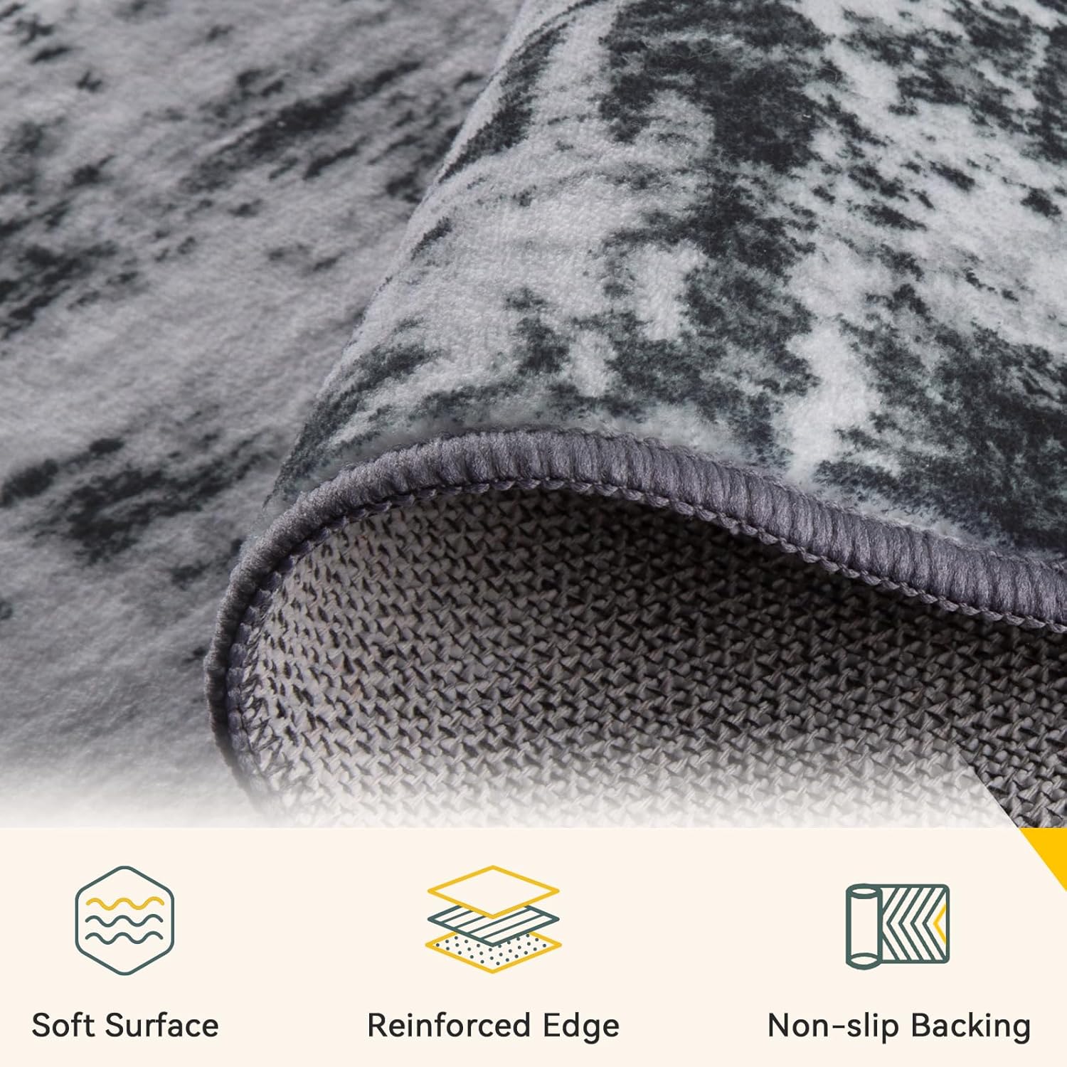 - Tides Series – Effortless style that flows with your life.This modern machine-washable non-slip rug features reinforced edges and a low-pile design that resists dirt. Its water-repellent surface makes spills easy to clean - liquids bead up for quick wiping. Simply machine wash in cold water (no bleach) to refresh. The non-slip backing keeps it securely in place. A perfect blend of function and contemporary design for active homes.