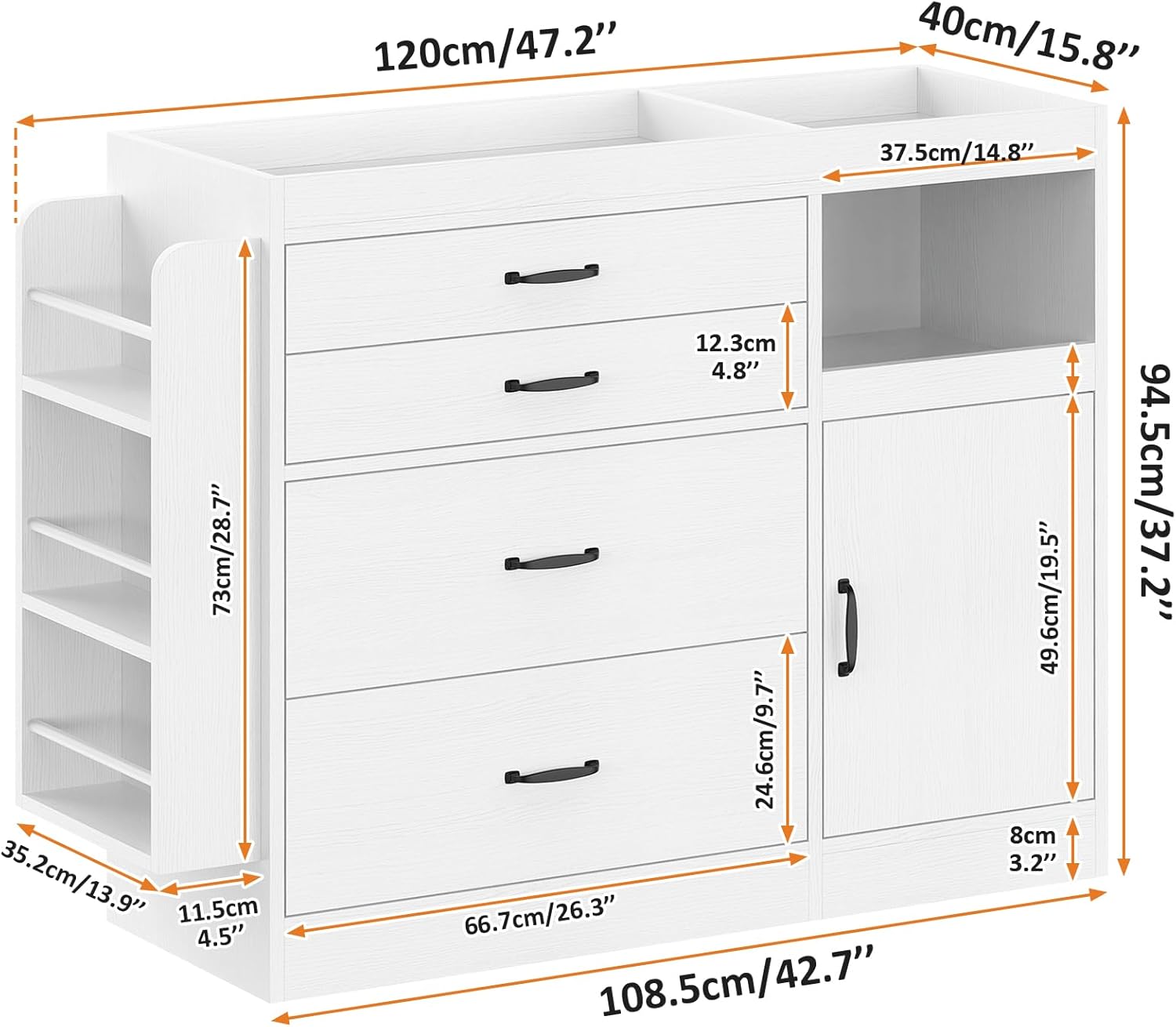 - Spacious Storage Solutions: With 4 smooth-gliding drawers (perfect for onesies, socks, and linens), a hidden cabinet (ideal for bulk diaper supplies or creams), and 3 open shelves (great for storybooks, stuffed animals, or decor), this dresser maximizes storage without sacrificing style. Measuring 47.2"W x 36.6"H x 15.8"D, it fits comfortably in most children’s rooms while offering ample space.