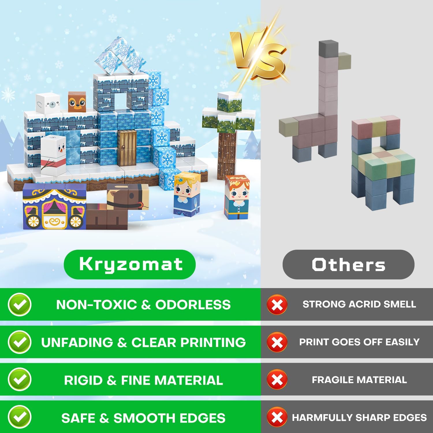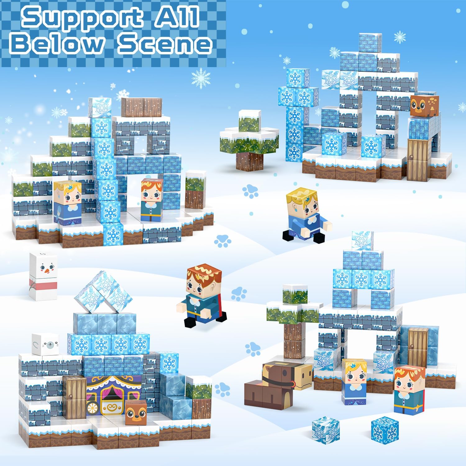 - Safe, Durable, Compatible Magnetic Blocks: Made with non-toxic materials and smooth edges, very safe for small hands of children over 3 years old. These washable, safety-certified magnetic cubes are built to last. Seamlessly connect with other magnetic tile sets to build expansive snowy scenes, or entirely new worlds