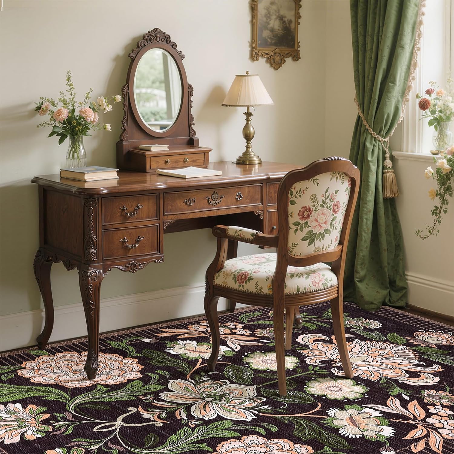 GarveeHome Plum Pink Floral Botanical Washable 5x7 Rug for Living Room, Black Purple Vintage Boho Cottage Throw Rugs Low Pile Carpet for Bedroom Dining Nursery Rug