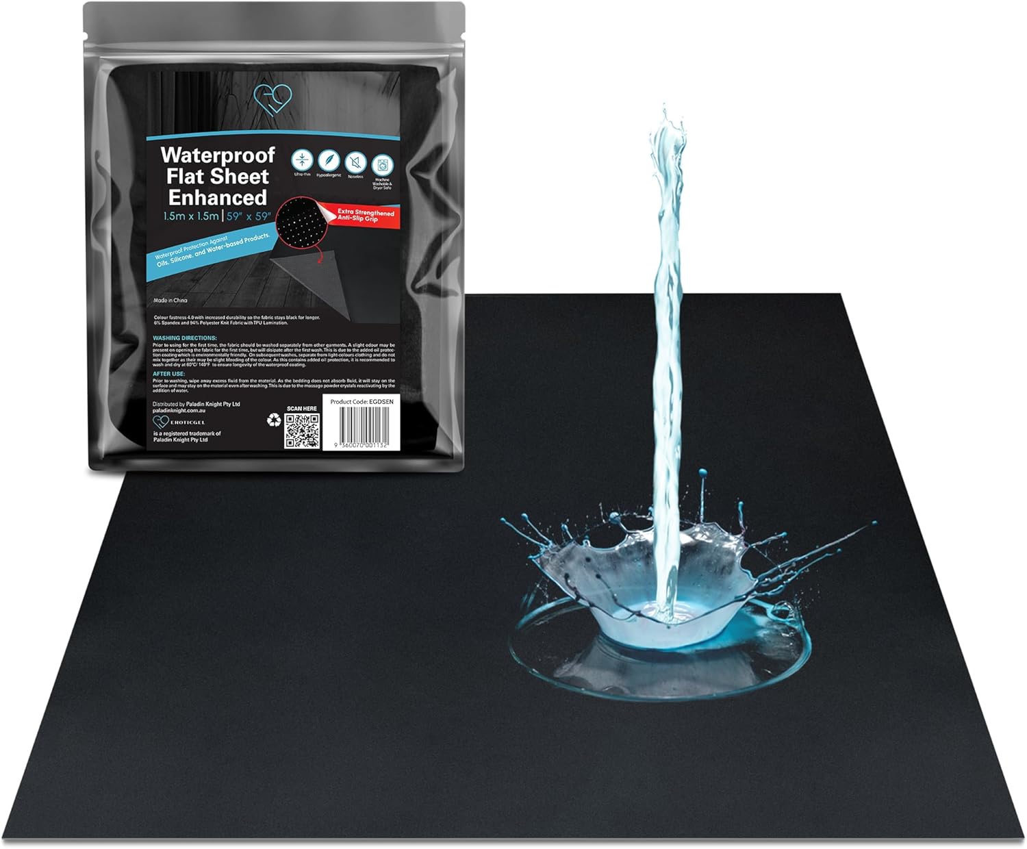 - Waterproof Protection: Have fun on any surface without worrying about stains or spills. This sleek black waterproof flat sheet keeps the surface clean and provides protection from oils, silicone, and water-based massage products.