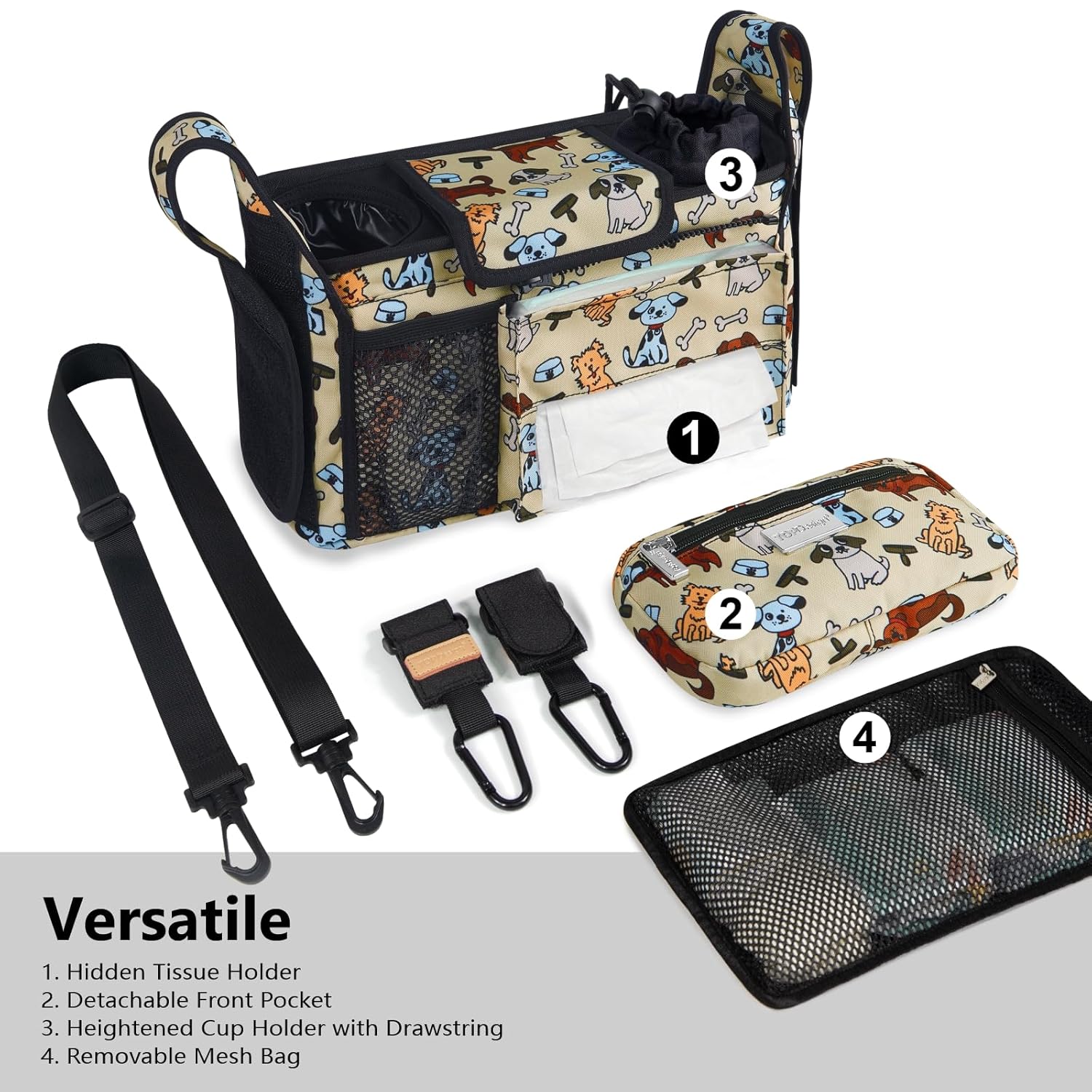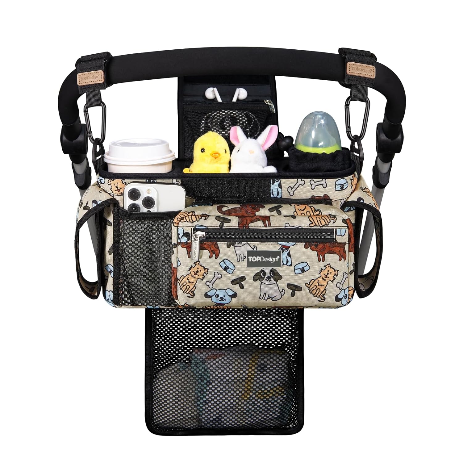 TOPDesign Universal Baby Stroller Organizer, Stroller Caddy with Detachable Mesh Bag & Heightened Insulated Cup Holders & Non-Slip Secure Hooks Accessories, Fits Most Strollers (Dogs)