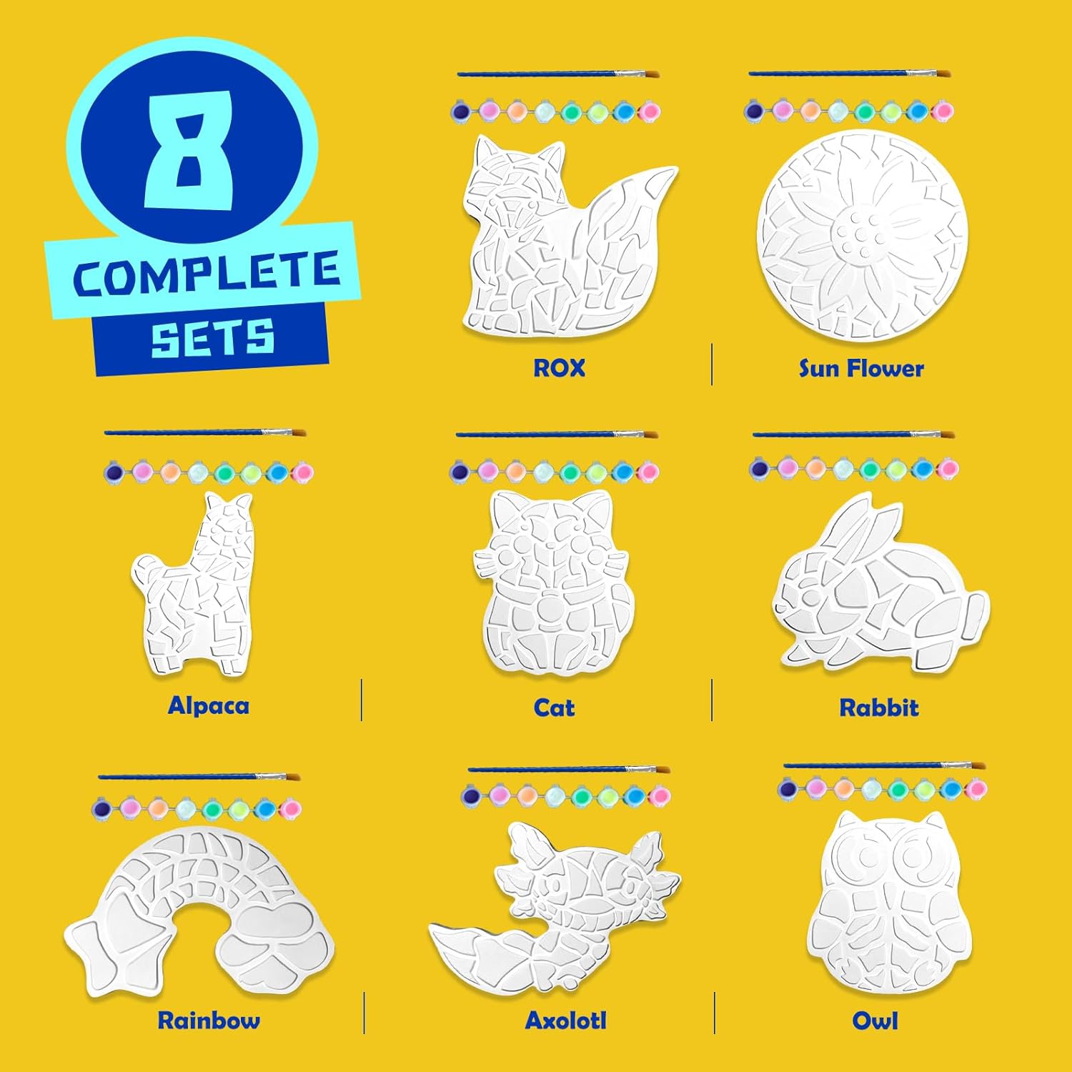- 8 Unique Plaster Mosaic Designs Used for Creative Art Projects: This stepping stone painting 7 year old arts and craft girls kit for kids comes with 8 detailed and fun plaster designs, including Sun Flower, Rabbit, Rainbow, Axolotl, Fox, Cat, Dog, Owl, Alpaca making it the perfect screen-free activity for kids. Ideal for creating kids’ hand-painted stepping stones that can be displayed indoors or outdoors