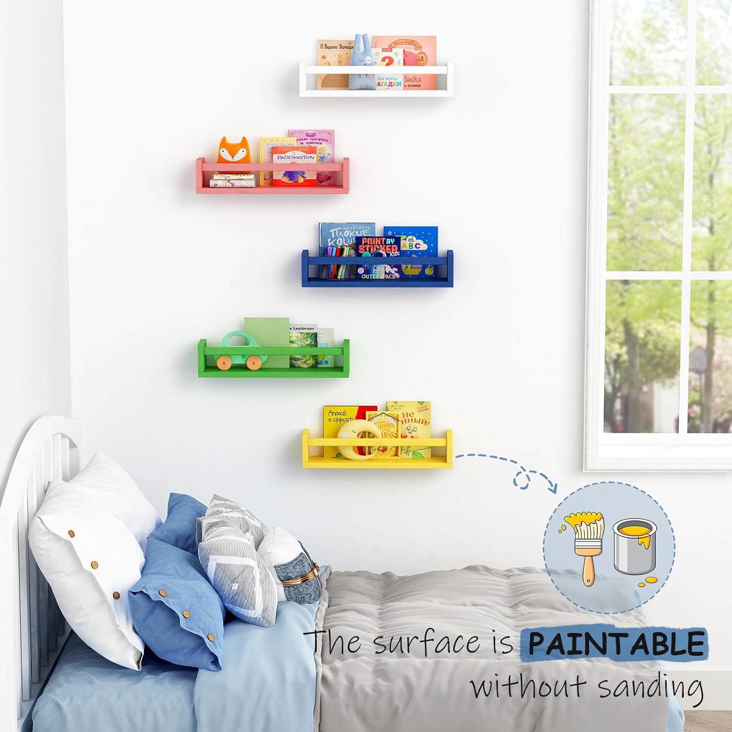 - [Versatile & Multifunctional] The nursery shelves wall mounted are no limit to creativity! Place them as wall bookshelf for kids room, baby book shelf for nursery, toddler book shelf and toy organizer for playroom, and it can even be used in the kitchen as a spice rack shelf. Mount them upside down as kids clothes shelves in the bathroom and closet. They're going to fit any small space and any stylish thanks to their essential classic design.