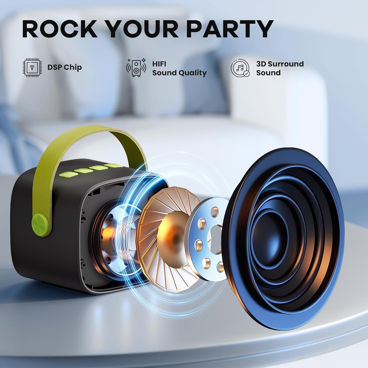 - Ultra-Portable Design -Take the party with you! This mini karaoke machine smaller than a lunchbox but packed with big fun! Delivers 4-8 hours of continuous playtime. Having fun without any interruption. This portable Bluetooth speaker and wireless karaoke microphone will meet all of your singing needs- easy to take on the go for family gatherings, camping, travel adventures, road trip, car karaoke, classrooms. With this ultra-portable mini karaoke machine, everywhere becomes a stage.