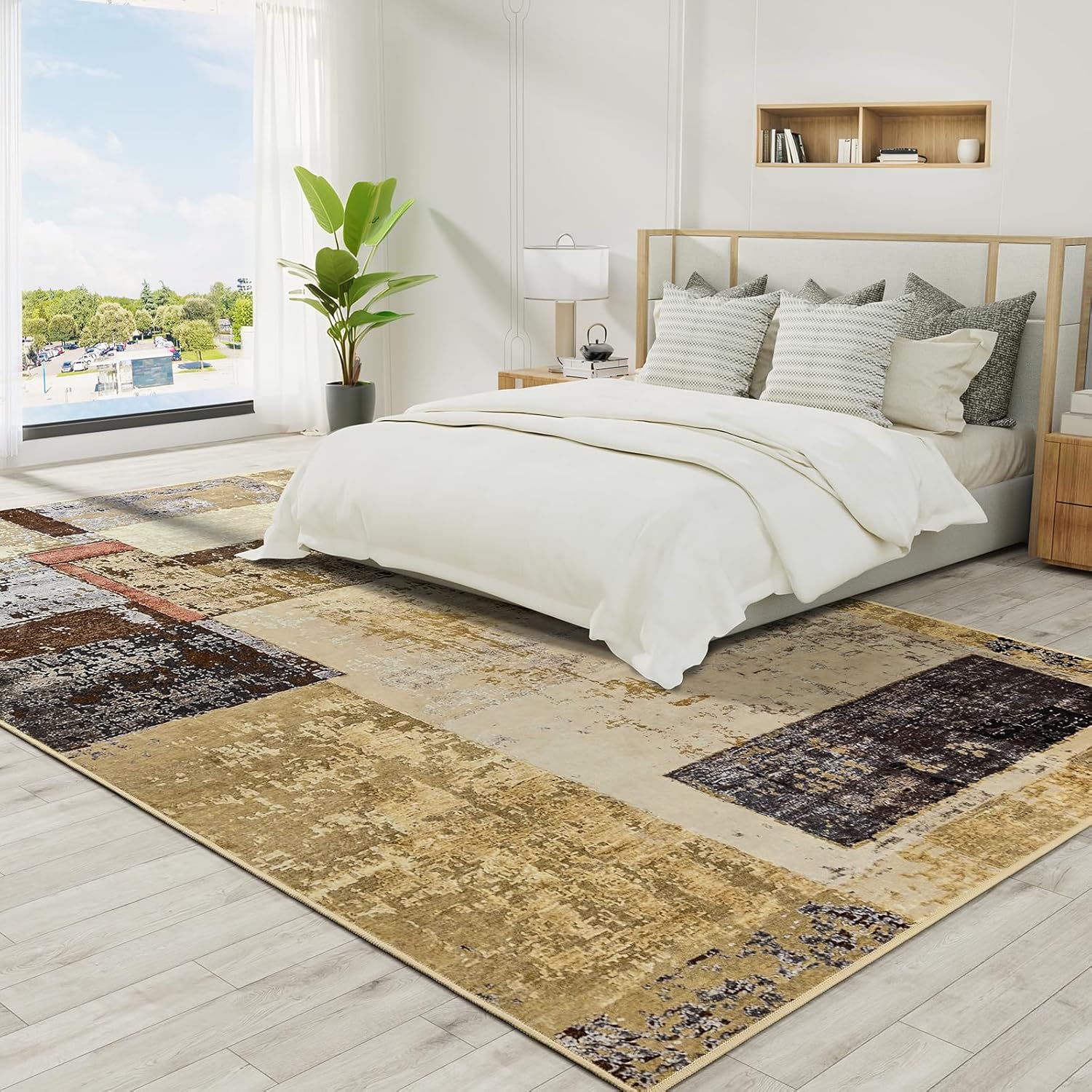 LOCHAS Rug for Living Room, Washable Soft Area Rugs for Bedroom 8x10, Abstract Carpet for Indoor Office Kids Dining Room Nursery Floor, Khaki Geometric Vintage Home Decor, Non Slip, Pet Child Friendly