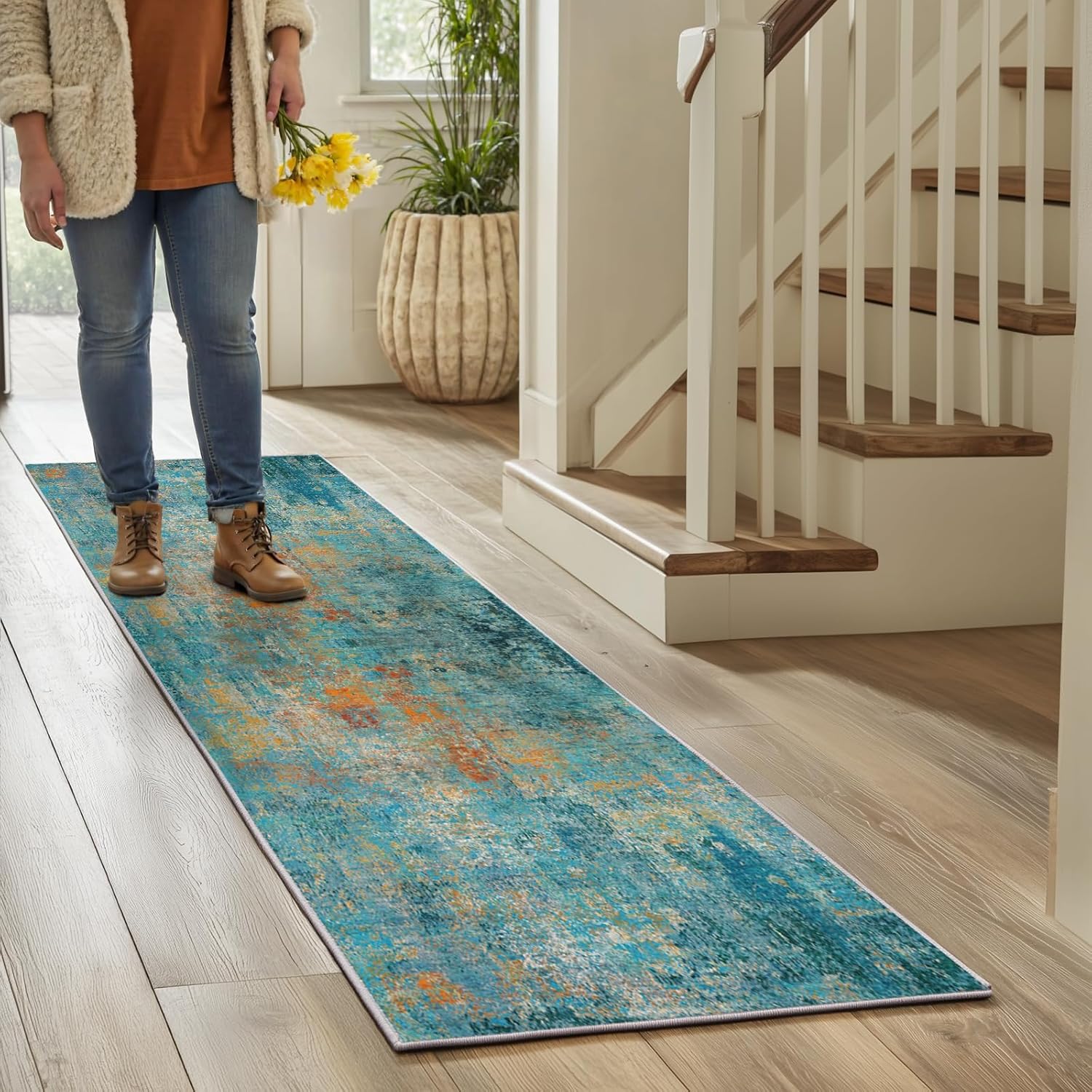 Washable Area Rugs 2'x6' Non-Slip Modern Abstract Soft for Living Room Entryway Bedroom Nursery, Print Pattern, Teal Blue Green Orange Rust Red Colorful