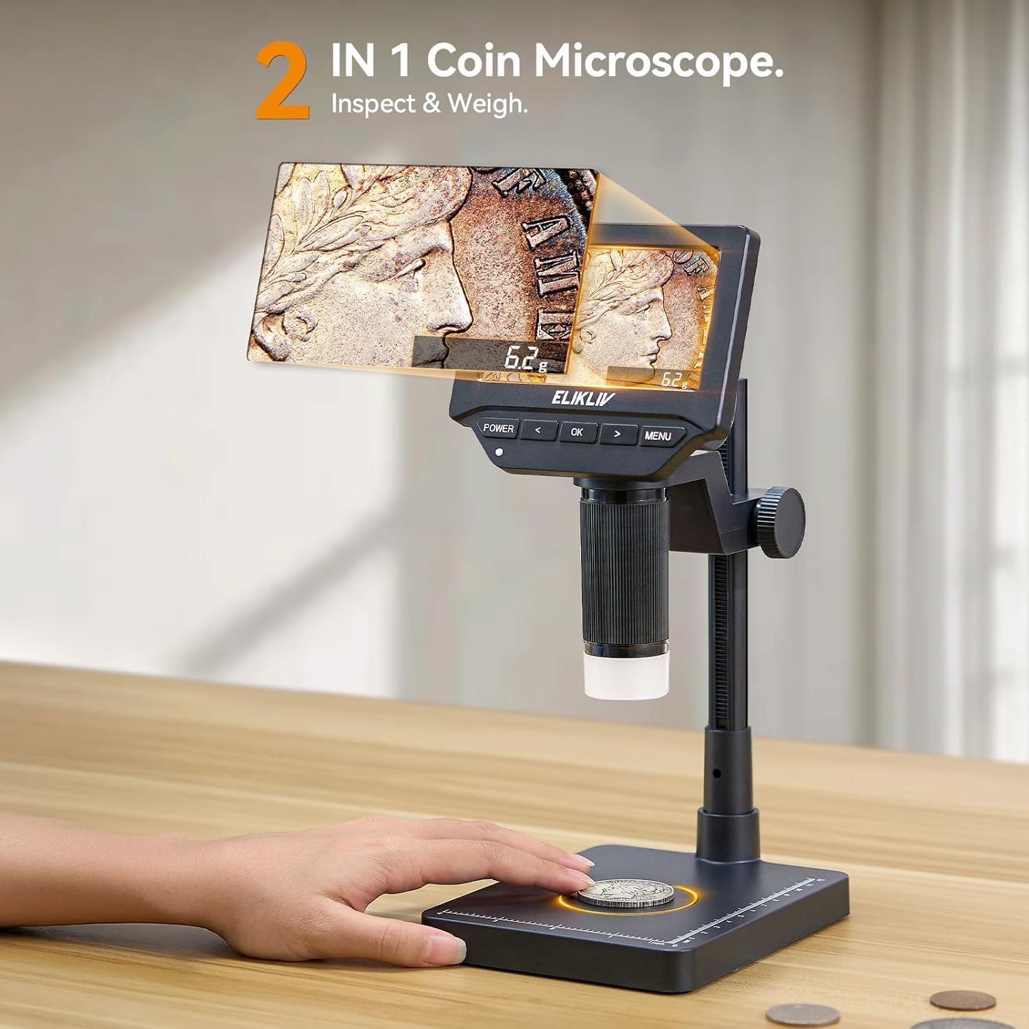 - Microscope & Scale 2-in-1: Elikliv EDM4C is the first coin microscope with built-in weighing scale, combining magnification and measurement in one device; This digital microscope lets you inspect mint marks and surface details while instantly weighing coins or jewelry — no need for separate tools; Perfect for error coin grading, authenticity checks, and collector archives