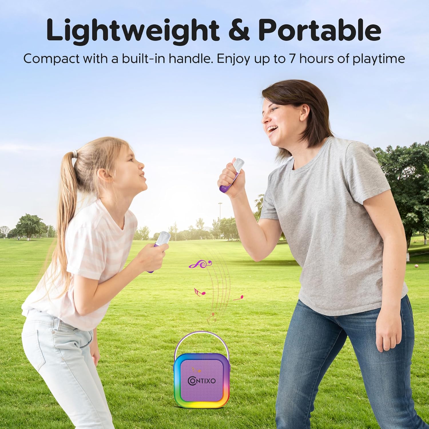 Contixo KS1A Kids Mini Karaoke Machine with LED Lights, 7–10H Playback, Dual Wireless Mics, Magic Voice Effects, Bluetooth Speaker for Children, Portable Singing Toy Gift for Boys & Girls, Purple